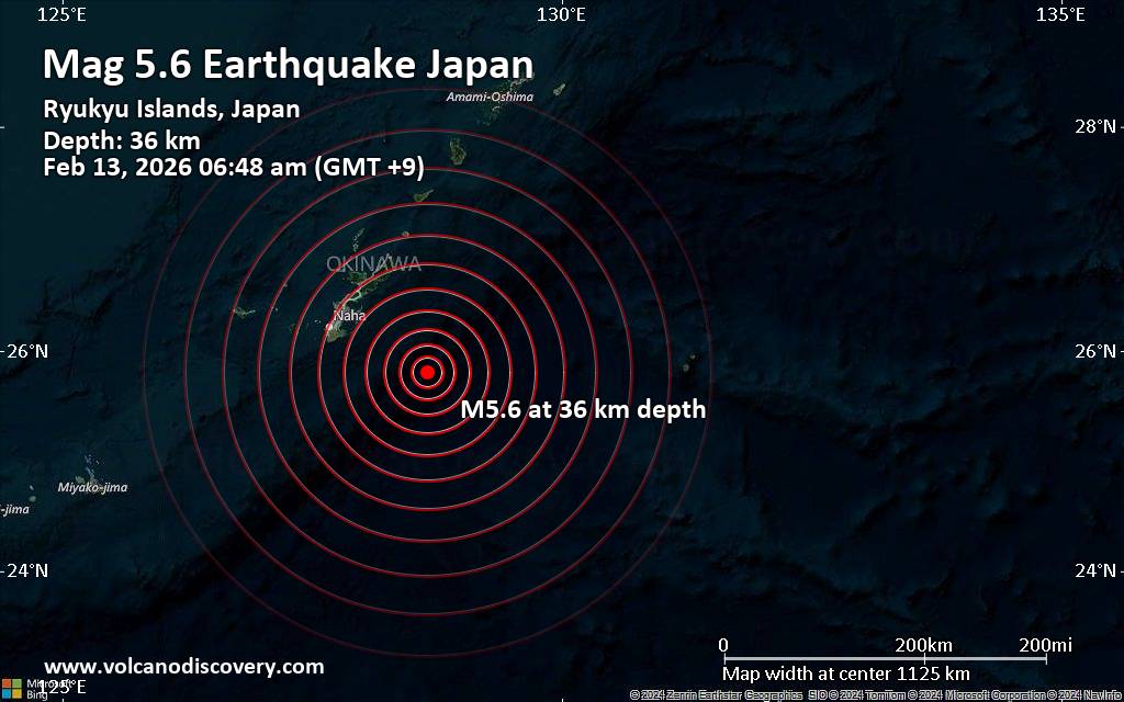 Earthquake data: Date & time: Feb 13, 2026 06:48 am (GMT +9) local time (12 Feb 2026 21:48 GMT)Magnitude: 5.6 Depth: 36.00 km Epicenter latitude / longitude: 25.81°N / 128.65°E  ( Okinawa, Japan) Primary data source: EMSChttps://www.volcanodiscovery.com/earthquake/news/294710/Significant-earthquake-of-magnitude-56-just-reported-100-km-southeast-of-Gushikawa-Japan.html