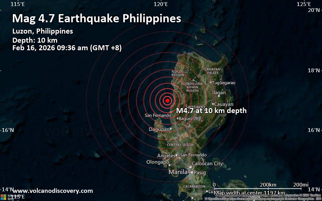Earthquake data: Date & time: Feb 16, 2026 09:36 am (Manila time) local time (16 Feb 2026 01:36 GMT)Magnitude: 4.7 Depth: 10.00 km Epicenter latitude / longitude: 16.99°N / 120.23°E  (La Union, Ilocos, Philippines) Primary data source: GFZhttps://www.volcanodiscovery.com/earthquake/news/295012/Moderate-magnitude-47-earthquake-24-km-northwest-of-Tagudin-Philippines.html