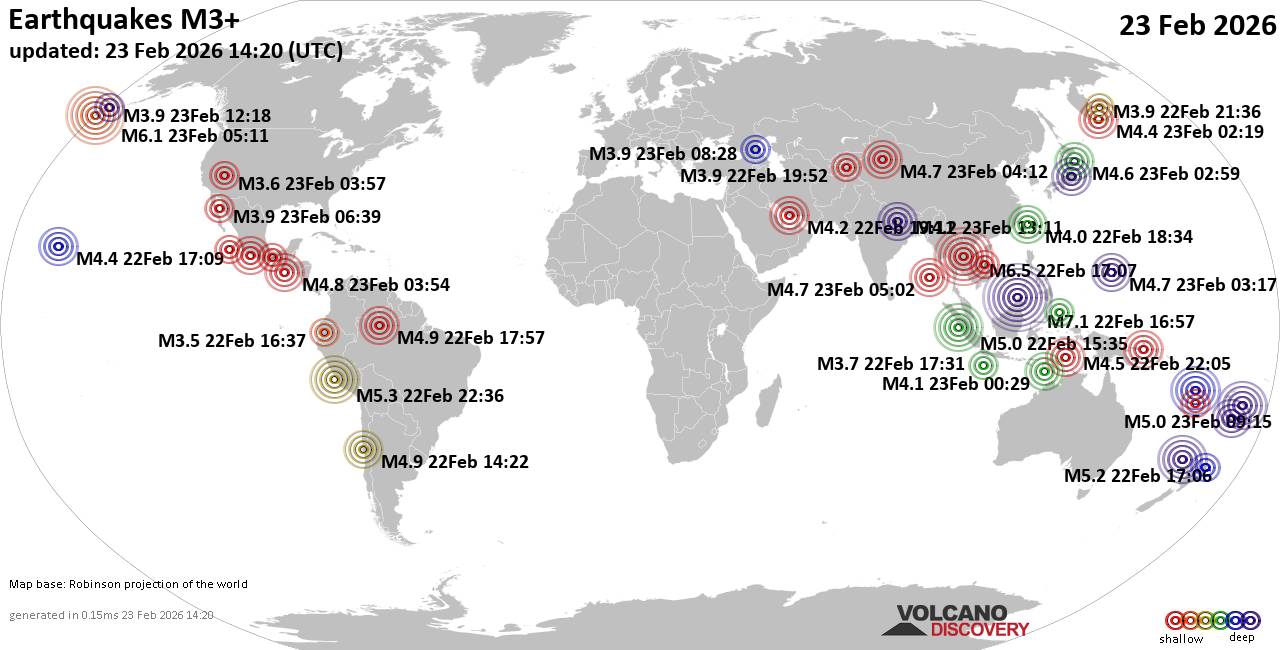World Earthquake Report for Monday, 23 February 2026 Worldwide earthquakes above magnitude 3 during the past 24 hours on 23 Feb 2026 Summary: 1 quake 7.0+, 2 quakes 6.0+, 6 quakes 5.0+, 34 quakes 4.0+, 175 quakes 3.0+, 348 quakes 2.0+ (566 total)This report is being updated every hour.Magnitude 7+: 1 earthquake Magnitude 6+: 2 earthquakes Magnitude 5+: 6 earthquakes Magnitude 4+: 34 earthquakes Magnitude 3+: 175 earthquakes Magnitude 2+: 348 earthquakes No quakes of magnitude 8 or higher 10 largest earthquakes in the world (past 24 hours)Monday, Feb 23, 2026, at 12:57 am (Kuching time) - Monday, Feb 23, 2026, at 12:07 am (Bangkok time) - Sunday, Feb 22, 2026, at 07:11 pm (GMT -10) - Monday, Feb 23, 2026, at 12:02 am (GMT -10) - Sunday, Feb 22, 2026, at 05:36 pm (GMT -5) - Monday, Feb 23, 2026, at 04:06 am (GMT +11) - Sunday, Feb 22, 2026, at 10:35 pm (GMT +7) - Monday, Feb 23, 2026, at 09:15 pm (GMT +12) - Monday, Feb 23, 2026, at 02:12 pm (Efate time) - Sunday, Feb 22, 2026, at 11:22 am (Santiago time) - Earthquakes reported feltMonday, Feb 23, 2026, at 12:57 am (Kuching time) - Sunday, Feb 22, 2026, at 09:40 pm (GMT -8) - Monday, Feb 23, 2026, at 12:07 am (Bangkok time) - Sunday, Feb 22, 2026, at 05:36 pm (GMT -5) - Monday, Feb 23, 2026, at 07:36 pm (GMT +8) - Sunday, Feb 22, 2026, at 10:35 pm (GMT +7) - Sunday, Feb 22, 2026, at 11:22 am (Santiago time) - Sunday, Feb 22, 2026, at 06:16 pm (GMT +1) - Sunday, Feb 22, 2026, at 01:16 pm (Panama time) - Sunday, Feb 22, 2026, at 08:25 am (GMT -10) - Sunday, Feb 22, 2026, at 10:39 pm (GMT -3) - Sunday, Feb 22, 2026, at 08:56 am (GMT -6) - Monday, Feb 23, 2026, at 06:21 am (GMT +2) - Monday, Feb 23, 2026, at 10:49 am (GMT +8) - Monday, Feb 23, 2026, at 01:41 am (GMT -6) - Monday, Feb 23, 2026, at 07:32 pm (GMT +8) - Sunday, Feb 22, 2026, at 07:45 pm (GMT -5) - Monday, Feb 23, 2026, at 07:06 am (GMT +8) - Monday, Feb 23, 2026, at 12:14 am (GMT +7) - Monday, Feb 23, 2026, at 02:34 am (Taipei time) - Sunday, Feb 22, 2026, at 11:37 am (GMT -5) - Sunday, Feb 22, 2026, at 11:15 am (Guatemala time) - Earthquake stats  https://www.volcanodiscovery.com/earthquake/news/295690/World-Earthquake-Report-for-Monday-23-February-2026.html