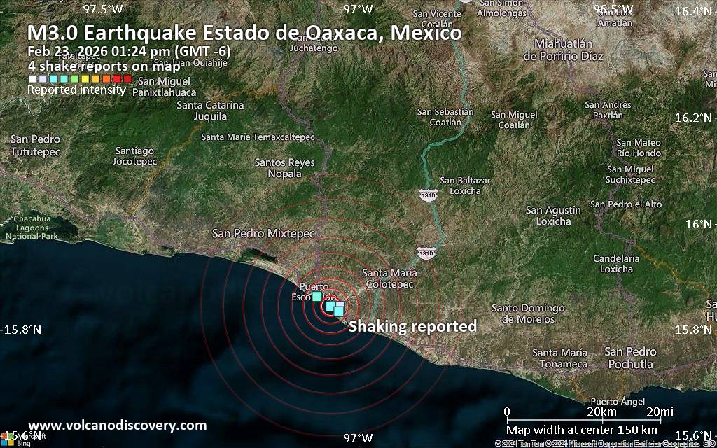 Earthquake data: Date & time: Feb 23, 2026 01:24 pm (GMT -6) local time (23 Feb 2026 19:24 GMT)Magnitude: unspecified Depth: unspecified Epicenter latitude / longitude: 15.84°N / 97.05°W  ( Estado de Oaxaca, Mexico) Primary data source: VolcanoDiscoveryhttps://www.volcanodiscovery.com/earthquake/news/295744/Seismic-like-event-possible-earthquake-reported-few-minutes-ago-near-Puerto-Escondido-Oaxaca-Mexico.html