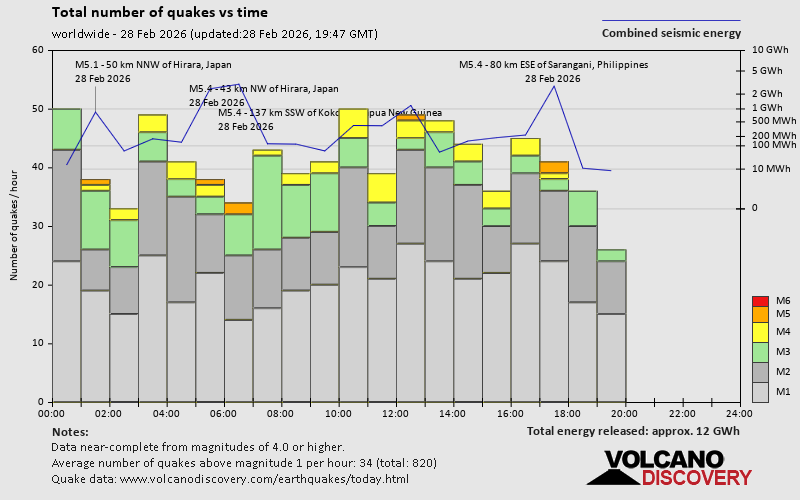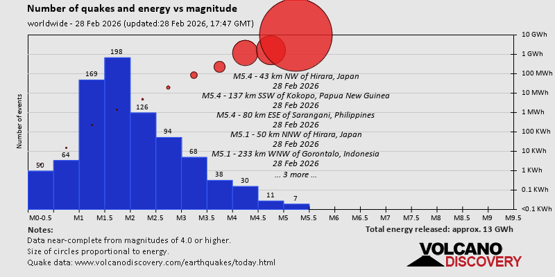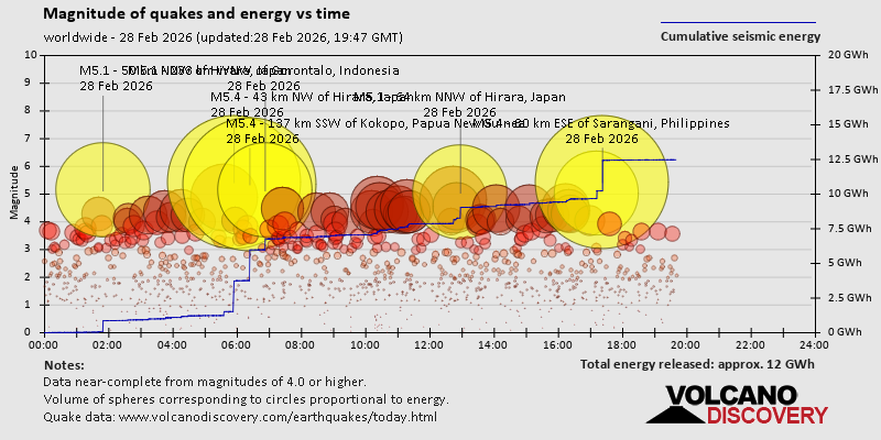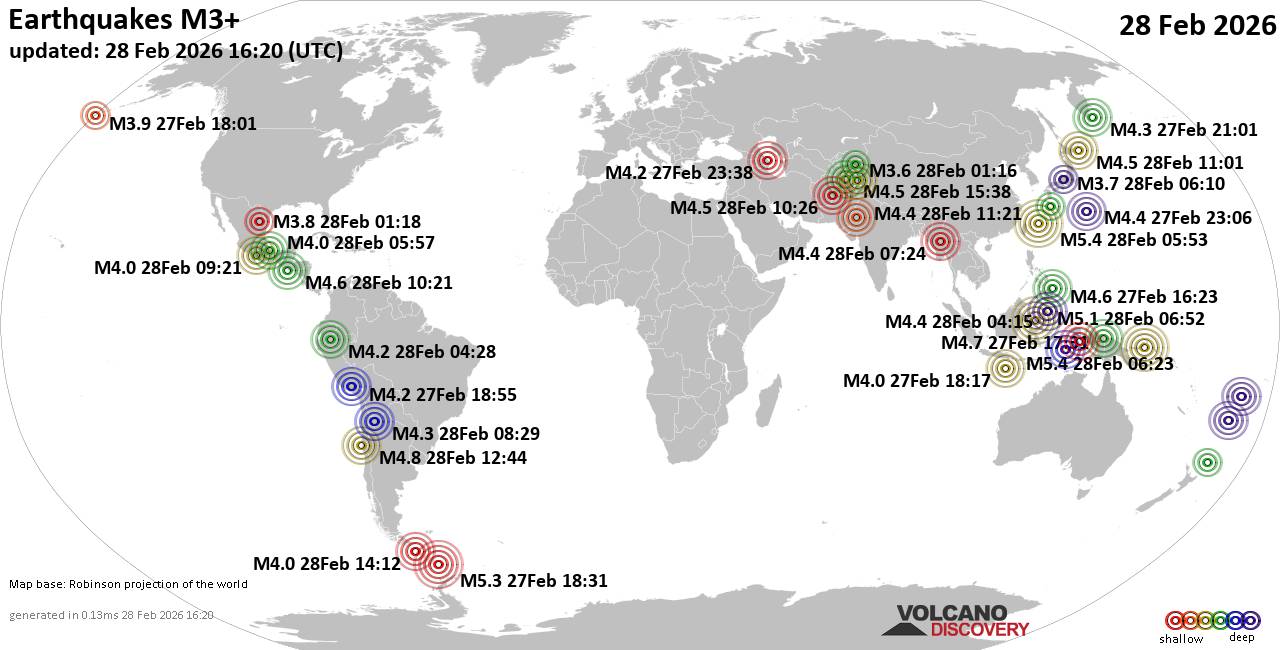World Earthquake Report for Saturday, 28 February 2026 Worldwide earthquakes above magnitude 3 during the past 24 hours on 28 Feb 2026 Summary: 6 quakes 5.0+, 49 quakes 4.0+, 162 quakes 3.0+, 336 quakes 2.0+ (553 total)This report is being updated every hour.Magnitude 5+: 6 earthquakes Magnitude 4+: 49 earthquakes Magnitude 3+: 162 earthquakes Magnitude 2+: 336 earthquakes No quakes of magnitude 6 or higher 10 largest earthquakes in the world (past 24 hours)Saturday, Feb 28, 2026, at 02:53 pm (GMT +9) - Saturday, Feb 28, 2026, at 04:23 pm (Port Moresby time) - Friday, Feb 27, 2026, at 02:31 pm (GMT -4) - Saturday, Feb 28, 2026, at 02:52 pm (Makassar time) - Saturday, Feb 28, 2026, at 10:49 am (GMT +9) - Saturday, Feb 28, 2026, at 09:56 pm (GMT +9) - Saturday, Feb 28, 2026, at 05:35 pm (Fiji time) - Saturday, Feb 28, 2026, at 07:44 am (GMT -5) - Saturday, Feb 28, 2026, at 02:31 am (Jayapura time) - Saturday, Feb 28, 2026, at 08:18 pm (GMT +9) - Earthquakes reported feltSaturday, Feb 28, 2026, at 11:19 am (GMT +1) - Saturday, Feb 28, 2026, at 01:08 am (GMT +3) - Saturday, Feb 28, 2026, at 12:24 am (GMT +5) - Friday, Feb 27, 2026, at 08:32 pm (GMT -3) - Saturday, Feb 28, 2026, at 12:23 am (Manila time) - Saturday, Feb 28, 2026, at 02:53 pm (GMT +9) - Saturday, Feb 28, 2026, at 01:58 am (GMT +8) - Saturday, Feb 28, 2026, at 09:26 am (GMT +3) - Friday, Feb 27, 2026, at 10:46 pm (GMT -4) - Saturday, Feb 28, 2026, at 01:45 pm (GMT +1) - Saturday, Feb 28, 2026, at 02:52 pm (Makassar time) - Friday, Feb 27, 2026, at 08:23 pm (GMT +1) - Earthquake stats  https://www.volcanodiscovery.com/earthquake/news/296186/World-Earthquake-Report-for-Saturday-28-February-2026.html