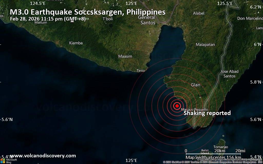 Earthquake data: Date & time: Feb 28, 2026 11:15 pm (GMT +8) local time (28 Feb 2026 15:15 GMT)Magnitude: unspecified Depth: unspecified Epicenter latitude / longitude: 5.67°N / 125.24°E  ( Soccsksargen, Philippines) Primary data source: VolcanoDiscoveryhttps://www.volcanodiscovery.com/earthquake/news/296271/Seismic-like-event-possible-earthquake-reported-few-minutes-ago-near-Glan-Soccsksargen-Philippines.html