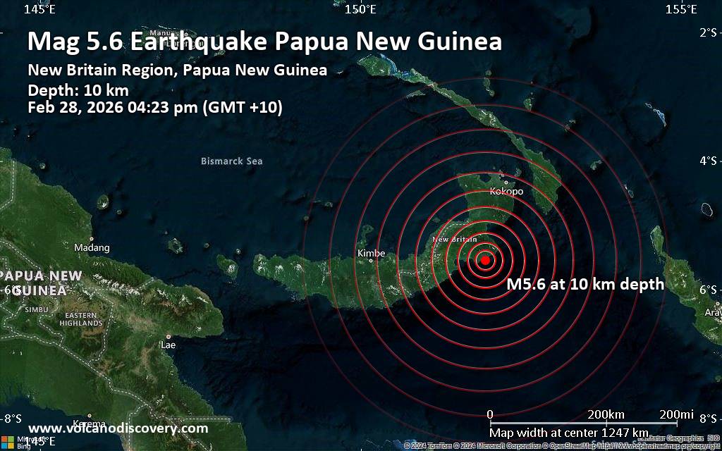 Significant earthquake of magnitude 5.6 just reported 139 km southwest of Kokopo, Papua New Guinea An earthquake of magnitude 5.6 occurred in the afternoon on Saturday, February 28th, 2026, at 4:23 pm local time near Kokopo, Kokopo District, East New Britain Province, Papua New Guinea, as reported by the German Research Centre for Geosciences (GFZ). According to preliminary data, the quake was located at a shallow depth of 10. km. Shallow earthquakes are felt more strongly than deeper ones as they are closer to the surface. The exact magnitude, epicenter, and depth of the quake might be revised within the next few hours or minutes as seismologists review data and refine their calculations, or as other agencies issue their report. Based on the preliminary seismic data, the quake should not have caused any significant damage, but was probably felt by many people as light vibration in the area of the epicenter. Weak shaking might have been felt in Kokopo (pop. 26,300) located 139 km from the epicenter. VolcanoDiscovery will automatically update magnitude and depth if these change and follow up if other significant news about the quake become available. If you’re in the area, please send us your experience through our reporting mechanism, either online or via our mobile app. This will help us provide more first-hand updates to anyone around the globe who wants to know more about this quake.