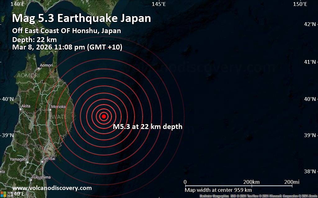 Earthquake data: Date & time: Mar 8, 2026 11:08 pm (GMT +10) local time (8 Mar 2026 13:08 GMT)Magnitude: 5.3 Depth: 22.00 km Epicenter latitude / longitude: 39.53°N / 143.05°E  ( Japan) Primary data source: EMSChttps://www.volcanodiscovery.com/earthquake/news/297056/Significant-magnitude-53-quake-hits-96-km-east-of-Miyako-Japan-late-at-night-.html