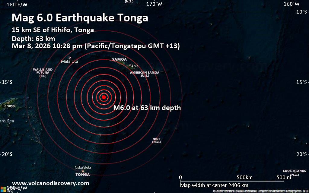 Significant earthquake of magnitude 6.0 just reported 16 km southeast of Hihifo, Tonga An earthquake of magnitude 6.0 occurred late at night on Sunday, March 8th, 2026, at 10:28 pm local time near Hihifo, Niuas, Tonga, as reported by the United States Geological Survey. According to preliminary data, the quake was located at a moderately shallow depth of 62.60 km. The exact magnitude, epicenter, and depth of the quake might be revised within the next few hours or minutes as seismologists review data and refine their calculations, or as other agencies issue their report. Based on the preliminary seismic data, the quake was probably felt by many people in the area of the epicenter. It should not have caused significant damage, other than objects falling from shelves, broken windows, etc. In Vaipoa (pop. 170) located 15 km from the epicenter, and Hihifo (pop. 300) 16 km away, the quake should have been felt as light shaking. VolcanoDiscovery will automatically update magnitude and depth if these change and follow up if other significant news about the quake become available. If you’re in the area, please send us your experience through our reporting mechanism, either online or via our mobile app. This will help us provide more first-hand updates to anyone around the globe who wants to know more about this quake.