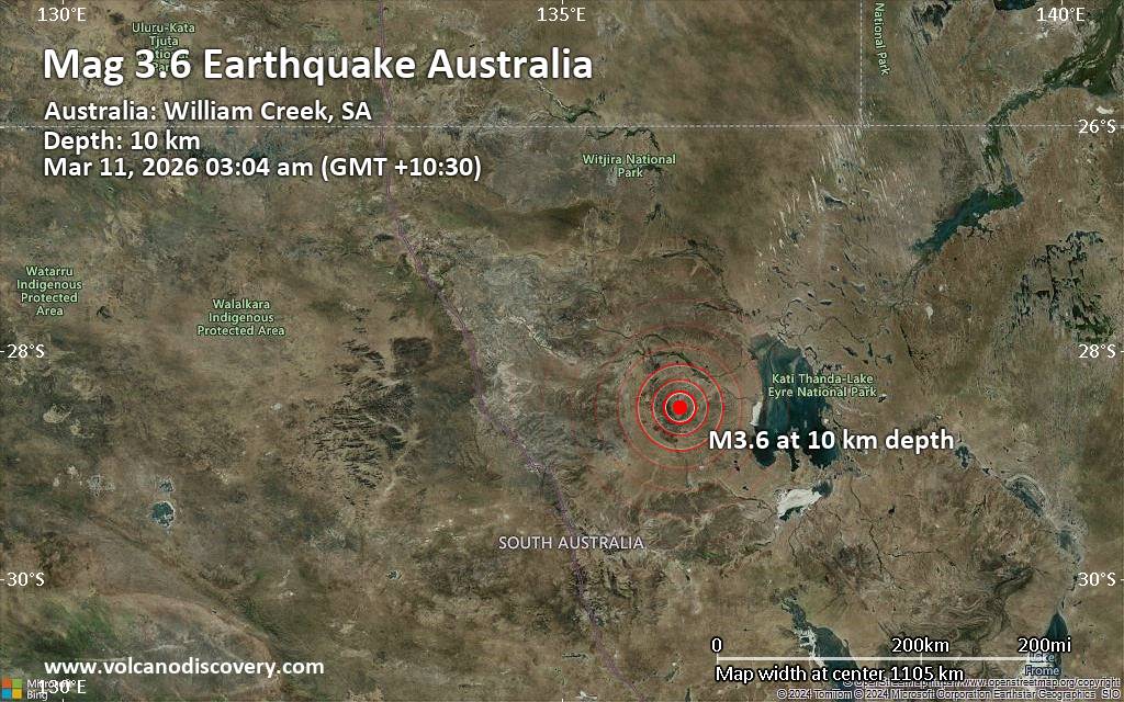 Earthquake data: Date & time: Mar 11, 2026 03:04 am (GMT +10:30) local time (10 Mar 2026 16:34 GMT)Magnitude: 3.6 Depth: 10.00 km Epicenter latitude / longitude: 28.5°S / 136.18°E  ( South Australia, Australia) Primary data source: GeoAuhttps://www.volcanodiscovery.com/earthquake/news/297261/Small-magnitude-36-quake-hits-30-miles-northwest-of-William-Creek-South-Australia-Australia-early-mo.html