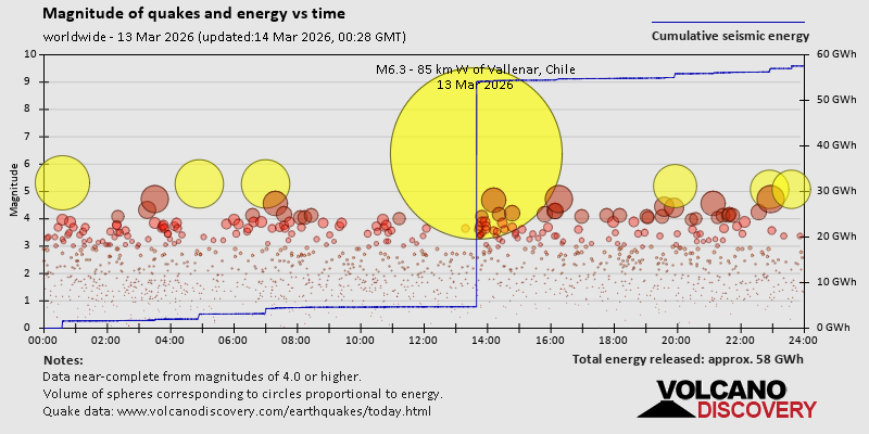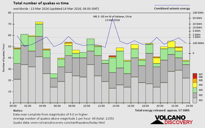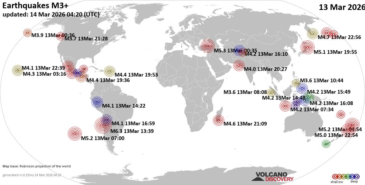 World Earthquake Report for Friday, 13 March 2026 Worldwide earthquakes above magnitude 3 during the past 24 hours on 14 Mar 2026 Summary: 1 quake 6.0+, 5 quakes 5.0+, 38 quakes 4.0+, 192 quakes 3.0+, 368 quakes 2.0+ (604 total)Magnitude 6+: 1 earthquake Magnitude 5+: 5 earthquakes Magnitude 4+: 38 earthquakes Magnitude 3+: 192 earthquakes Magnitude 2+: 368 earthquakes No quakes of magnitude 7 or higher 10 largest earthquakes in the world (13 Mar 2026)Friday, Mar 13, 2026, at 09:39 am (GMT -4) - Friday, Mar 13, 2026, at 03:35 am (Istanbul time) - Friday, Mar 13, 2026, at 05:54 pm (GMT +13) - Friday, Mar 13, 2026, at 12:00 am (GMT -7) - Saturday, Mar 14, 2026, at 04:55 am (GMT +9) - Saturday, Mar 14, 2026, at 10:54 am (GMT +12) - Thursday, Mar 12, 2026, at 06:30 pm (GMT -9) - Saturday, Mar 14, 2026, at 10:56 am (GMT +12) - Saturday, Mar 14, 2026, at 04:15 am (GMT +12) - Saturday, Mar 14, 2026, at 12:09 am (Antananarivo time) - Earthquakes reported feltFriday, Mar 13, 2026, at 09:39 am (GMT -4) - Friday, Mar 13, 2026, at 03:35 am (Istanbul time) - Thursday, Mar 12, 2026, at 05:16 pm (Honolulu time) - Friday, Mar 13, 2026, at 03:53 pm (GMT -4) - Friday, Mar 13, 2026, at 04:25 am (GMT +2) - Saturday, Mar 14, 2026, at 12:09 am (Antananarivo time) - Friday, Mar 13, 2026, at 01:36 pm (GMT -6) - Friday, Mar 13, 2026, at 09:55 am (GMT -6) - Friday, Mar 13, 2026, at 12:38 pm (GMT +2) - Friday, Mar 13, 2026, at 05:25 am (GMT -7) - Friday, Mar 13, 2026, at 03:47 am (GMT +3) - Friday, Mar 13, 2026, at 10:43 am (GMT -3) - Friday, Mar 13, 2026, at 01:59 pm (GMT +2) - Saturday, Mar 14, 2026, at 04:55 am (GMT +9) - Saturday, Mar 14, 2026, at 11:36 am (GMT +12) - Friday, Mar 13, 2026, at 01:35 pm (GMT -7) - Friday, Mar 13, 2026, at 11:19 pm (Kolkata time) - Earthquake stats  https://www.volcanodiscovery.com/earthquake/news/297493/World-Earthquake-Report-for-Friday-13-March-2026.html