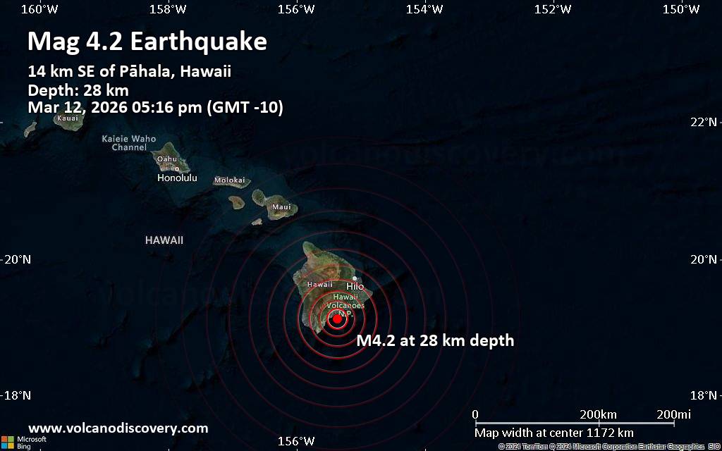 Moderate magnitude 4.2 quake hits 45 miles southwest of Hilo, Hawaii, United States in the afternoon A shallow magnitude 4.2 earthquake was reported in the afternoon near Hilo, Hawaii County, Hawaii, USA. According to the United States Geological Survey, the quake hit on Thursday, March 12th, 2026, at 5:16 pm local time at a shallow depth of 18 miles. Shallow earthquakes are felt more strongly than deeper ones as they are closer to the surface. The exact magnitude, epicenter, and depth of the quake might be revised within the next few hours or minutes as seismologists review data and refine their calculations, or as other agencies issue their report. Based on the preliminary seismic data, the quake should not have caused any significant damage, but was probably felt by many people as light vibration in the area of the epicenter. Weak shaking might have been felt in Pāhala (pop. 1,400) located 9 miles from the epicenter, and Discovery Harbor (pop. 1,200) 18 miles away. Other towns or cities near the epicenter where the quake might have been felt as very weak shaking include Volcano (pop. 2,600) located 24 miles from the epicenter, Hawaiian Ocean View (pop. 4,400) 26 miles away, Fern Forest (pop. 1,200) 28 miles away, Eden Roc (pop. 1,400) 31 miles away, Mountain View (pop. 3,900) 34 miles away, Hawaiian Paradise Park (pop. 11,400) 41 miles away, and Hilo (pop. 43,300) 45 miles away.