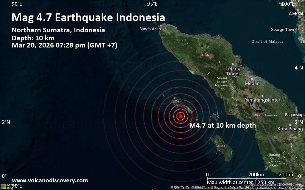 Earthquake data: Date & time: Mar 20, 2026 12:28 pm (Universal Time) local time (20 Mar 2026 12:28 GMT)Magnitude: 4.8 Depth: 10.00 km Epicenter latitude / longitude: 2.23°N / 96.03°E  (Simeulue Regency, Nanggroe Aceh Darussalam Province, Indonesia) Primary data source: BMKGhttps://www.volcanodiscovery.com/earthquake/news/298075/Moderate-earthquake-of-magnitude-47-just-reported-48-km-southwest-of-Sinabang-Indonesia.html