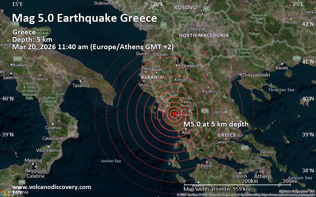 Earthquake data: Date & time: Mar 20, 2026 09:40 am (Universal Time) local time (20 Mar 2026 09:40 GMT)Magnitude: 5.0 Depth: 5.00 km Epicenter latitude / longitude: 39.57°N / 20.59°E  ( Dimos Zitsa, Epirus, Greece) Primary data source: EMSChttps://www.volcanodiscovery.com/earthquake/news/298067/Significant-magnitude-50-quake-hits-25-km-southwest-of-Ioannina-Greece-in-the-morning-.html