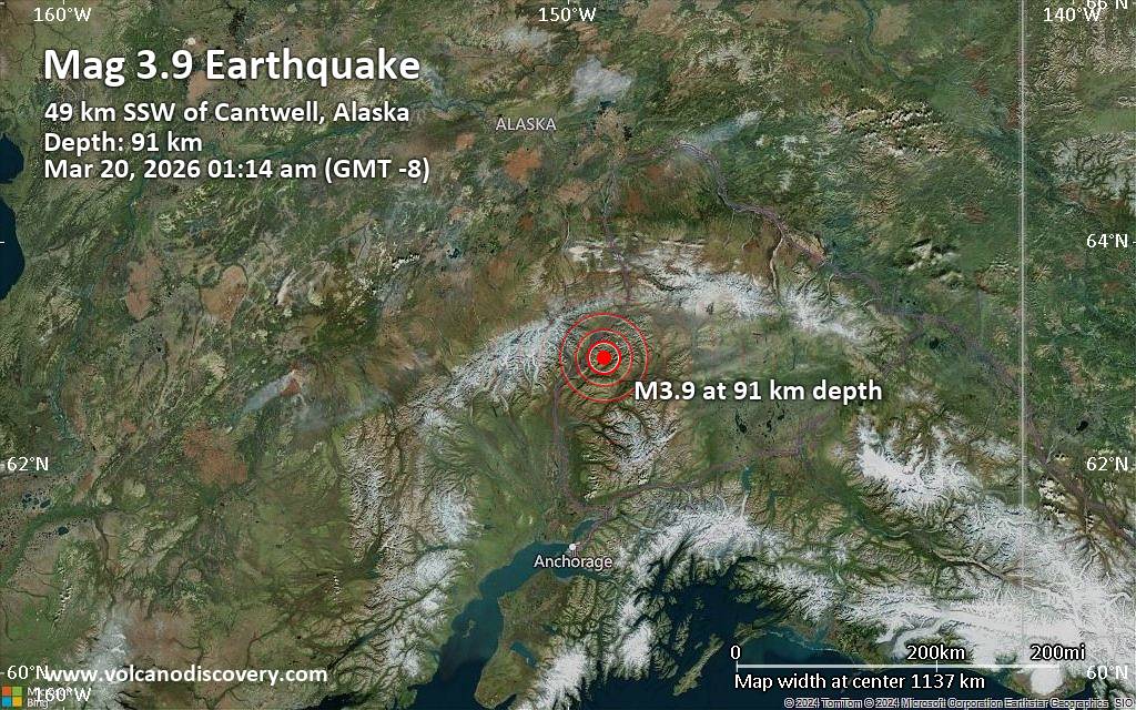 Earthquake data: Date & time: Mar 20, 2026 01:14 am (Anchorage time) local time (20 Mar 2026 09:14 GMT)Magnitude: 3.9 Depth: 90.50 km Epicenter latitude / longitude: 62.98°N / 149.28°W  ( Matanuska-Susitna Borough, Alaska, United States) Primary data source: USGShttps://www.volcanodiscovery.com/earthquake/news/298061/Magnitude-39-earthquake-strikes-near-Cantwell-Denali-Alaska-USA.html