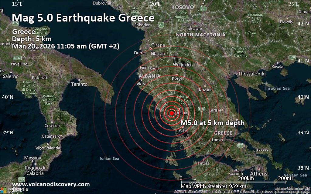 Significant 5.0 quake hits near Ioannina, Epirus, Greece The European-Mediterranean Seismological Centre (EMSC) reported a magnitude 5.0 quake in Greece near Ioannina, Epirus, only 4 minutes ago. The earthquake hit in the morning on Friday, March 20th, 2026, at 11:05 am local time at a very shallow depth of 5. km. The exact magnitude, epicenter, and depth of the quake might be revised within the next few hours or minutes as seismologists review data and refine their calculations, or as other agencies issue their report. Our monitoring service identified a second report from the National Observatory of Athens (NOA) which listed the quake at magnitude 4.6. Other agencies reporting the same quake include the German Research Centre for Geosciences (GFZ) at magnitude 5.0, The Aristotle University of Thessaloniki Geophysical Lab. (AUTH) at magnitude 4.4, The Seismological Laboratory of the University of Athens (UOA) at magnitude 4.5, and the citizen-seismograph network of RaspberryShake at magnitude 5.0. Based on the preliminary seismic data, the quake should have been widely felt by almost everyone in the area of the epicenter. It might have caused light to moderate damage. Moderate shaking probably occurred in Paramythia (pop. 2,600) located 11 km from the epicenter. In Eleousa (pop. 3,500) located 25 km from the epicenter, Anatoli (pop. 9,800) 25 km away, Ioannina (pop. 65,600) 26 km away, Katsikas (pop. 3,900) 27 km away, and Igoumenitsa (pop. 9,500) 28 km away, the quake should have been felt as light shaking. Weak shaking might have been felt in Arta (pop. 21,900) located 55 km from the epicenter, and Preveza (pop. 17,300) 68 km away. VolcanoDiscovery will automatically update magnitude and depth if these change and follow up if other significant news about the quake become available. If you’re in the area, please send us your experience through our reporting mechanism, either online or via our mobile app. This will help us provide more first-hand updates to anyone around the globe who wants to know more about this quake.