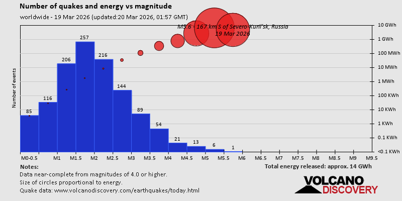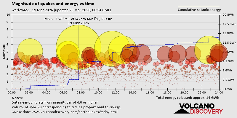 World Earthquake Report for Thursday, 19 March 2026 Worldwide earthquakes above magnitude 3 during the past 24 hours on 20 Mar 2026 Summary: 7 quakes 5.0+, 35 quakes 4.0+, 163 quakes 3.0+, 368 quakes 2.0+ (573 total)Magnitude 5+: 7 earthquakes Magnitude 4+: 35 earthquakes Magnitude 3+: 163 earthquakes Magnitude 2+: 368 earthquakes No quakes of magnitude 6 or higher 10 largest earthquakes in the world (19 Mar 2026)Thursday, Mar 19, 2026, at 05:43 pm (GMT +10) - Thursday, Mar 19, 2026, at 06:36 am (GMT -5) - Thursday, Mar 19, 2026, at 10:48 pm (GMT +10) - Thursday, Mar 19, 2026, at 06:46 pm (GMT -4) - Thursday, Mar 19, 2026, at 12:07 am (GMT -2) - Thursday, Mar 19, 2026, at 11:32 am (GMT +5) - Thursday, Mar 19, 2026, at 11:26 am (GMT +5) - Friday, Mar 20, 2026, at 03:00 am (GMT +12) - Friday, Mar 20, 2026, at 12:43 am (GMT +11) - Friday, Mar 20, 2026, at 05:10 am (GMT +10) - Earthquakes reported feltThursday, Mar 19, 2026, at 11:29 am (Rome time) - Wednesday, Mar 18, 2026, at 07:47 pm (GMT -6) - Wednesday, Mar 18, 2026, at 07:55 pm (GMT -6) - Thursday, Mar 19, 2026, at 05:25 am (Mexico City time) - Thursday, Mar 19, 2026, at 09:31 pm (GMT +2) - Friday, Mar 20, 2026, at 04:26 am (Kolkata time) - Thursday, Mar 19, 2026, at 06:41 pm (Bogota time) - Thursday, Mar 19, 2026, at 06:36 am (GMT -5) - Thursday, Mar 19, 2026, at 02:32 am (GMT -4) - Thursday, Mar 19, 2026, at 11:43 am (GMT +1) - Thursday, Mar 19, 2026, at 08:01 am (Mexico City time) - Wednesday, Mar 18, 2026, at 08:36 pm (Guatemala time) - Wednesday, Mar 18, 2026, at 08:03 pm (GMT -6) - Thursday, Mar 19, 2026, at 06:46 pm (GMT -4) - Thursday, Mar 19, 2026, at 07:20 am (GMT +2) - Thursday, Mar 19, 2026, at 05:57 pm (Guatemala time) - Thursday, Mar 19, 2026, at 05:50 pm (GMT -5) - Wednesday, Mar 18, 2026, at 07:55 pm (GMT -5) - Thursday, Mar 19, 2026, at 01:07 pm (GMT +2) - Wednesday, Mar 18, 2026, at 08:11 pm (GMT -6) - Earthquake stats  https://www.volcanodiscovery.com/earthquake/news/297954/World-Earthquake-Report-for-Thursday-19-March-2026.html