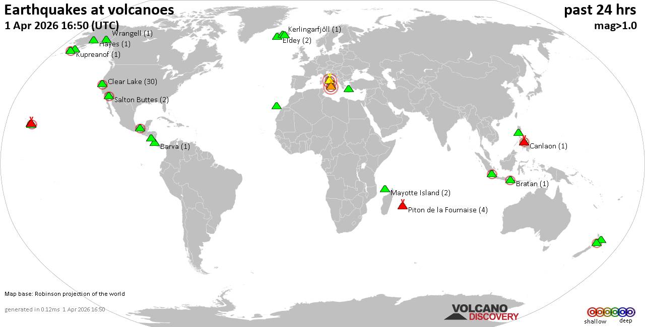 Volcano earthquake report for Wednesday, 1 Apr 2026 World map showing volcanoes with shallow (less than 50 km) earthquakes within 20 km radius during the past 24 hours on 1 Apr 2026 Number in brackets indicate nr of quakes. Quakes detected near: Aniakchak (1 quake mag 1.0), Barva (1 quake mag 2.1), Bratan (2 quakes between mag 2.0-2.4), Campi Flegrei (Phlegrean Fields) (2 quakes between mag 0.7-3.0), Canlaon (1 quake mag 2.4), Clear Lake (29 quakes between mag 0.2-2.1) El Chichón (6 quakes between mag 2.2-3.0), Eldey (2 quakes between mag 1.4-1.5), Etna (1 quake mag 3.0), Hayes (1 quake mag 1.0), Hiuchi (1 quake mag 3.0), Hulubelu (3 quakes between mag 2.5-2.5), Kerlingarfjöll (1 quake mag 1.1), Kilauea (3 quakes between mag 1.7-2.2), Kolumbo (2 quakes between mag 1.2-1.6), Loihi (2 quakes between mag 1.7-2.1), Loki-Fögrufjöll volcano (3 quakes between mag 0.9-1.3), Maunaloa (1 quake mag 2.7), Mayotte Island (1 quake mag 1.2), Piton de la Fournaise (5 quakes between mag 0.5-1.4), Ruapehu (1 quake mag 2.0), Salton Buttes (2 quakes between mag 2.1-2.4), Stepovak Bay 4 (2 quakes between mag 1.4-2.3), Tenerife (5 quakes between mag 0.9-1.7), Wrangell (1 quake mag 1.5) (updated 12h50) Note: Earthquakes within 20 km from and at depths less than 50 km under active volcanoes are reported. The list is not complete because many volcanoes are not monitored and/or seismic data in high resolution is not available publicly.