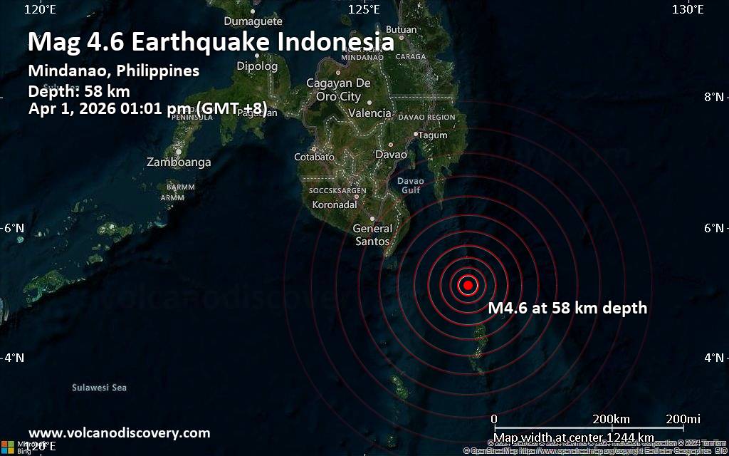 An earthquake of magnitude 4.6 occurred around noon on Wednesday, April 1st, 2026, at 1:01 pm local time near Miangas, Sulawesi Utara, Indonesia, as reported by Indonesia's Meteorology, Climatology, and Geophysical Agency.