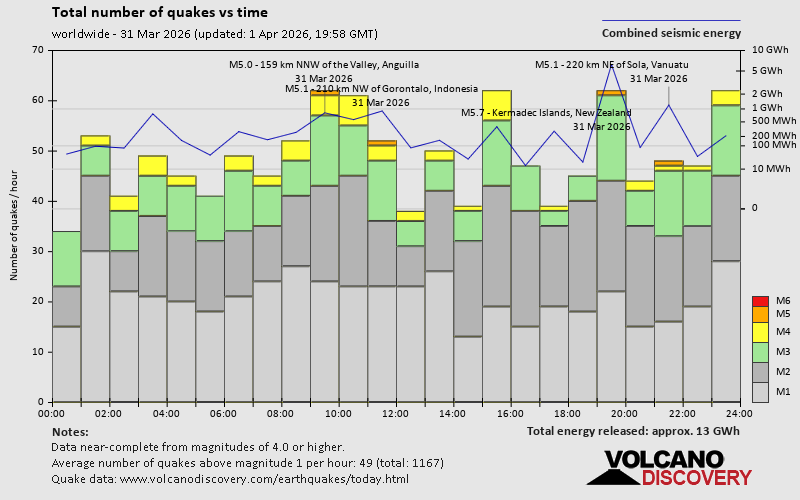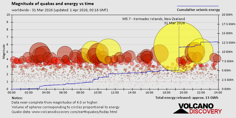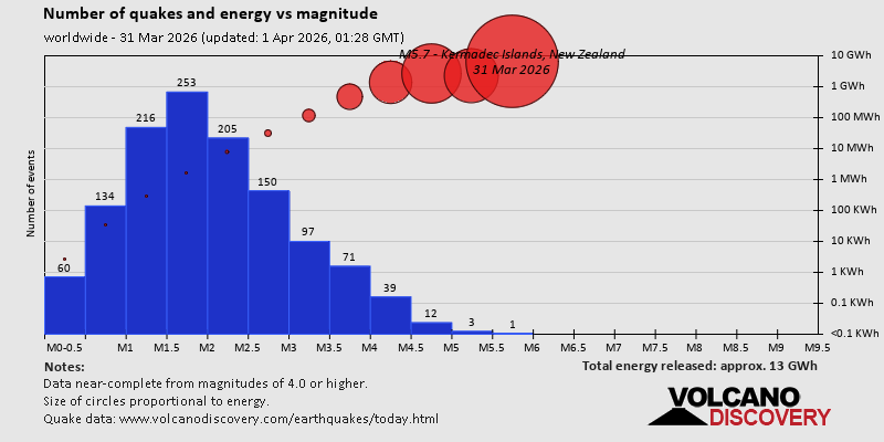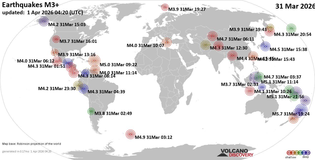 World Earthquake Report for Tuesday, 31 March 2026 Worldwide earthquakes above magnitude 3 during the past 24 hours on 1 Apr 2026 Summary: 4 quakes 5.0+, 52 quakes 4.0+, 202 quakes 3.0+, 375 quakes 2.0+ (633 total)Magnitude 5+: 4 earthquakes Magnitude 4+: 52 earthquakes Magnitude 3+: 202 earthquakes Magnitude 2+: 375 earthquakes No quakes of magnitude 6 or higher 10 largest earthquakes in the world (31 Mar 2026)Wednesday, Apr 1, 2026, at 08:24 am (GMT +13) - Wednesday, Apr 1, 2026, at 08:56 am (GMT +11) - Tuesday, Mar 31, 2026, at 07:14 pm (GMT +8) - Tuesday, Mar 31, 2026, at 05:22 am (GMT -4) - Tuesday, Mar 31, 2026, at 09:03 pm (Efate time) - Tuesday, Mar 31, 2026, at 05:15 pm (GMT -4) - Tuesday, Mar 31, 2026, at 01:12 am (GMT -2) - Tuesday, Mar 31, 2026, at 05:09 am (GMT -12) - Tuesday, Mar 31, 2026, at 11:11 am (Almaty time) - Tuesday, Mar 31, 2026, at 11:37 am (GMT +8) - Earthquakes reported feltTuesday, Mar 31, 2026, at 01:07 pm (GMT +3) - Tuesday, Mar 31, 2026, at 05:15 pm (GMT -4) - Tuesday, Mar 31, 2026, at 10:02 am (GMT +2) - Tuesday, Mar 31, 2026, at 11:19 pm (GMT +13) - Tuesday, Mar 31, 2026, at 11:43 pm (Taipei time) - Tuesday, Mar 31, 2026, at 11:11 am (Almaty time) - Tuesday, Mar 31, 2026, at 01:23 pm (Almaty time) - Tuesday, Mar 31, 2026, at 04:58 pm (GMT -3) - Tuesday, Mar 31, 2026, at 07:20 pm (GMT +9) - Tuesday, Mar 31, 2026, at 05:22 am (GMT -4) - Tuesday, Mar 31, 2026, at 07:14 pm (GMT +8) - Wednesday, Apr 1, 2026, at 08:24 am (GMT +13) - Tuesday, Mar 31, 2026, at 01:20 pm (GMT +6) - Wednesday, Apr 1, 2026, at 01:13 am (GMT +3) - Monday, Mar 30, 2026, at 11:01 pm (GMT -6) - Monday, Mar 30, 2026, at 11:39 pm (GMT -5) - Wednesday, Apr 1, 2026, at 12:08 am (GMT +2) - Earthquake stats  https://www.volcanodiscovery.com/earthquake/news/298929/World-Earthquake-Report-for-Tuesday-31-March-2026.html