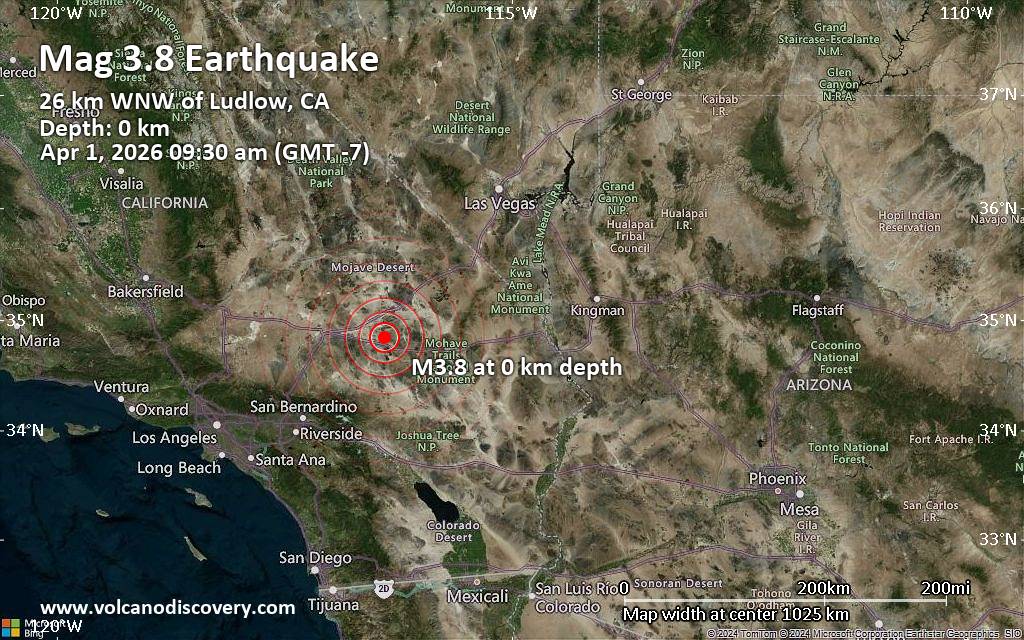 Earthquake data: Date & time: Apr 1, 2026 09:30 am (GMT -7) local time (1 Apr 2026 16:30 GMT)Magnitude: 3.8 Depth: 0.26 km Epicenter latitude / longitude: 34.84°N / 116.4°W  ( San Bernardino County, California, United States) Primary data source: USGShttps://www.volcanodiscovery.com/earthquake/news/299033/Magnitude-38-earthquake-strikes-near-Barstow-San-Bernardino-County-California-USA.html