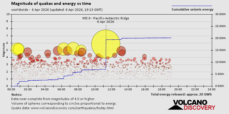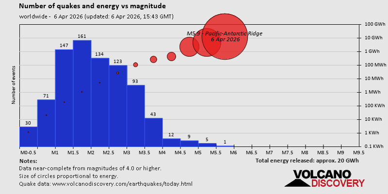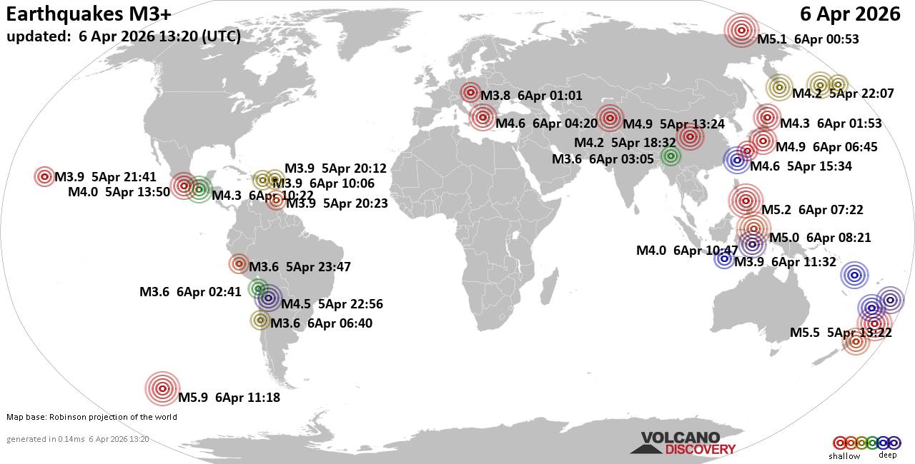 World Earthquake Report for Monday, 6 April 2026 Worldwide earthquakes above magnitude 3 during the past 24 hours on 6 Apr 2026 Summary: 10 quakes 5.0+, 41 quakes 4.0+, 211 quakes 3.0+, 473 quakes 2.0+ (735 total)This report is being updated every hour.Magnitude 5+: 10 earthquakes Magnitude 4+: 41 earthquakes Magnitude 3+: 211 earthquakes Magnitude 2+: 473 earthquakes No quakes of magnitude 6 or higher 10 largest earthquakes in the world (past 24 hours)Monday, Apr 6, 2026, at 02:18 am (GMT -9) - Monday, Apr 6, 2026, at 01:22 am (GMT +12) - Monday, Apr 6, 2026, at 05:20 am (GMT +12) - Monday, Apr 6, 2026, at 03:22 pm (Manila time) - Monday, Apr 6, 2026, at 05:19 am (GMT +12) - Monday, Apr 6, 2026, at 12:42 pm (GMT +12) - Monday, Apr 6, 2026, at 06:15 pm (GMT +12) - Monday, Apr 6, 2026, at 11:53 am (GMT +11) - Monday, Apr 6, 2026, at 05:10 am (GMT +12) - Monday, Apr 6, 2026, at 05:21 pm (GMT +9) - Earthquakes reported feltMonday, Apr 6, 2026, at 03:22 pm (Manila time) - Monday, Apr 6, 2026, at 07:20 am (Athens time) - Monday, Apr 6, 2026, at 04:14 am (GMT +2) - Monday, Apr 6, 2026, at 10:52 am (GMT +3) - Sunday, Apr 5, 2026, at 11:41 am (Honolulu time) - Monday, Apr 6, 2026, at 06:34 am (Athens time) - Monday, Apr 6, 2026, at 03:01 am (Vienna time) - Sunday, Apr 5, 2026, at 08:30 pm (GMT -5) - Sunday, Apr 5, 2026, at 07:24 pm (Urumqi time) - Sunday, Apr 5, 2026, at 06:46 pm (Moscow time) - Monday, Apr 6, 2026, at 06:41 am (GMT +3) - Monday, Apr 6, 2026, at 03:52 pm (GMT +8) - Monday, Apr 6, 2026, at 07:24 am (GMT +3) - Monday, Apr 6, 2026, at 02:32 pm (Jayapura time) - Monday, Apr 6, 2026, at 10:54 am (GMT +3) - Sunday, Apr 5, 2026, at 02:46 pm (GMT -4) - Sunday, Apr 5, 2026, at 06:47 pm (Lima time) - Monday, Apr 6, 2026, at 06:26 pm (GMT +12) - Earthquake stats  https://www.volcanodiscovery.com/earthquake/news/299367/World-Earthquake-Report-for-Monday-6-April-2026.html