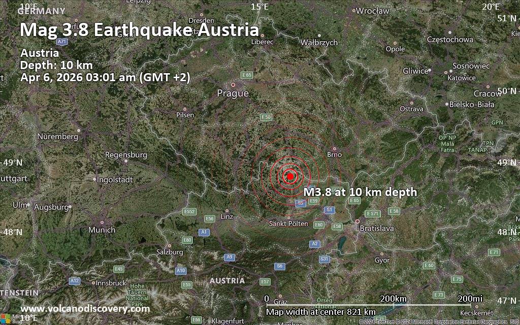 Small magnitude 3.8 earthquake 84 km northwest of Vienna, Austria An earthquake of magnitude 3.8 occurred early morning on Monday, April 6th, 2026, at 3:01 am local time near Vienna, Austria, as reported by Hungary's Seismological Observatory (Hungarian National Seismological Network). According to preliminary data, the quake was located at a shallow depth of 10. km. Shallow earthquakes are felt more strongly than deeper ones as they are closer to the surface. The exact magnitude, epicenter, and depth of the quake might be revised within the next few hours or minutes as seismologists review data and refine their calculations, or as other agencies issue their report. Based on the preliminary seismic data, the quake should not have caused any significant damage, but was probably felt by many people as light vibration in the area of the epicenter. Weak shaking might have been felt in Raabs an der Thaya (pop. 810) located 12 km from the epicenter, Horn (pop. 5,500) 15 km away, and Eggenburg (pop. 3,100) 22 km away. Other towns or cities near the epicenter where the quake might have been felt as very weak shaking include Znojmo (pop. 35,300) located 30 km from the epicenter, Krems an der Donau (pop. 14,500) 43 km away, Trebic (pop. 38,800) 49 km away, Stockerau (pop. 16,300) 62 km away, Sankt Poelten (pop. 21,900) 66 km away, and Sankt Pölten (pop. 21,900) 67 km away. In Vienna (pop. 1,691,500, 84 km away), the quake was probably not felt.