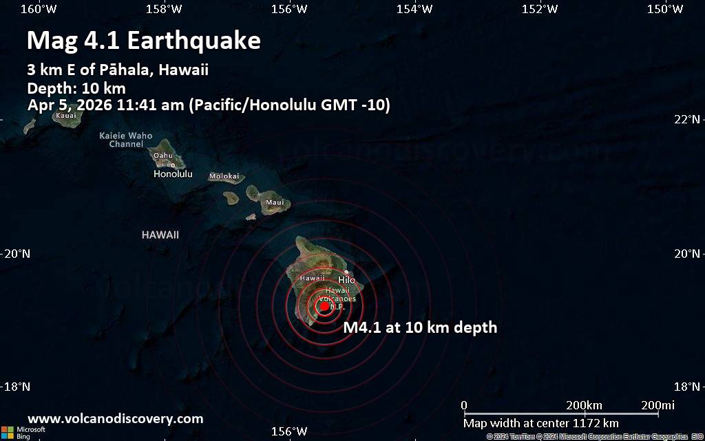 Earthquake data: Date & time: Apr 5, 2026 11:41 am (Honolulu time) local time (5 Apr 2026 21:41 GMT)Magnitude: 4.1 Depth: 10.00 km Epicenter latitude / longitude: 19.21°N / 155.45°W  ( Hawaii County, Hawaii, United States) Primary data source: USGShttps://www.volcanodiscovery.com/earthquake/news/299342/Moderate-magnitude-41-quake-hits-43-miles-southwest-of-Hilo-Hawaii-United-States-in-the-morning-.html