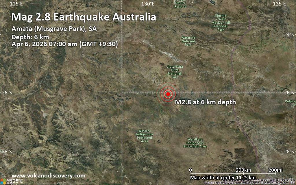 Earthquake data: Date & time: Apr 6, 2026 07:00 am (GMT +9:30) local time (5 Apr 2026 21:30 GMT)Magnitude: 2.8 Depth: 6.30 km Epicenter latitude / longitude: 26.05°S / 130.76°E  ( Anangu Pitjantjatjara, South Australia, Australia) Primary data source: GeoAuhttps://www.volcanodiscovery.com/earthquake/news/299338/Magnitude-28-earthquake-strikes-near-Amata-Anangu-Pitjantjatjara-South-Australia-Australia.html