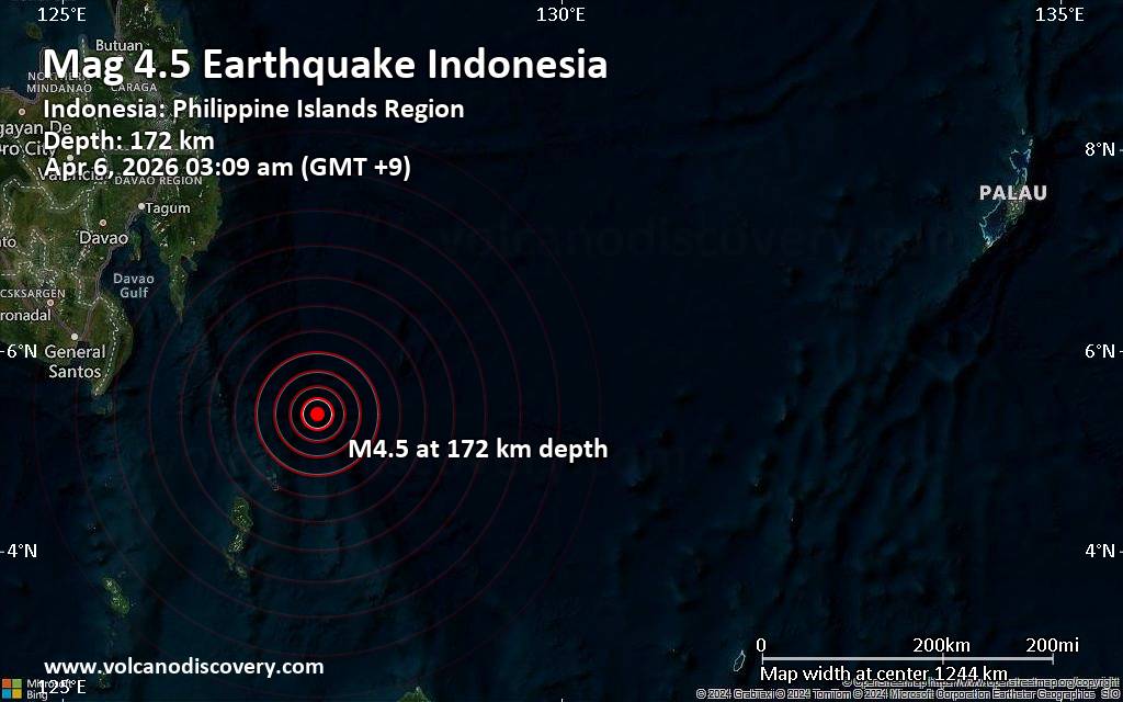 Moderate magnitude 4.5 earthquake 110 km east of Miangas, Indonesia A magnitude 4.5 earthquake near Miangas, Sulawesi Utara, Indonesia, was reported only 9 minutes ago by Indonesia's Meteorology, Climatology, and Geophysical Agency, considered the main national agency that monitors seismic activity in Indonesia. The earthquake occurred at an intermediate to considerable depth of 172. km beneath the epicenter early morning on Monday, April 6th, 2026, at 3:09 am local time. The exact magnitude, epicenter, and depth of the quake might be revised within the next few hours or minutes as seismologists review data and refine their calculations, or as other agencies issue their report. A second report was later issued by the citizen-seismograph network of RaspberryShake, which listed it as a magnitude 4.4 earthquake. According to preliminary calculations, we do not expect that the quake was felt by many people and did not cause any damage. In Miangas (pop. 820, 110 km away), the quake was probably not felt. VolcanoDiscovery will automatically update magnitude and depth if these change and follow up if other significant news about the quake become available. If you’re in the area, please send us your experience through our reporting mechanism, either online or via our mobile app. This will help us provide more first-hand updates to anyone around the globe who wants to know more about this quake.