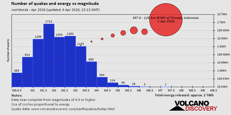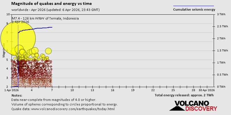 World Earthquake Report for April 2026 Worldwide earthquakes above magnitude 5.5 during April 2026 Summary: 1 quake 7.0+, 3 quakes 6.0+, 60 quakes 5.0+, 334 quakes 4.0+, 1499 quakes 3.0+, 2148 quakes 2.0+ (4045 total)This report is being updated every day.Magnitude 9+: none Magnitude 8+: none Magnitude 7+: 1 earthquake Magnitude 6+: 3 earthquakes Magnitude 5+: 60 earthquakes Magnitude 4+: 334 earthquakes Magnitude 3+: 1499 earthquakes Magnitude 2+: 2148 earthquakes No quakes of magnitude 8 or higher List of 10 largest earthquakes in the world during April 2026:Thursday, Apr 2, 2026, at 07:48 am (Jayapura time) - Thursday, Apr 2, 2026, at 12:23 pm (Jayapura time) - Wednesday, Apr 1, 2026, at 06:20 am (Lima time) - Saturday, Apr 4, 2026, at 06:34 pm (GMT +8) - Thursday, Apr 2, 2026, at 11:13 pm (Jayapura time) - Saturday, Apr 4, 2026, at 10:35 am (Jayapura time) - Thursday, Apr 2, 2026, at 11:34 pm (Jayapura time) - Friday, Apr 3, 2026, at 08:42 pm (GMT +4:30) - Thursday, Apr 2, 2026, at 12:17 pm (Jayapura time) - Wednesday, Apr 1, 2026, at 06:08 pm (GMT +12) - Earthquake stats:  https://www.volcanodiscovery.com/view_news/299131/World-Earthquake-Report-for-April-2026.html
