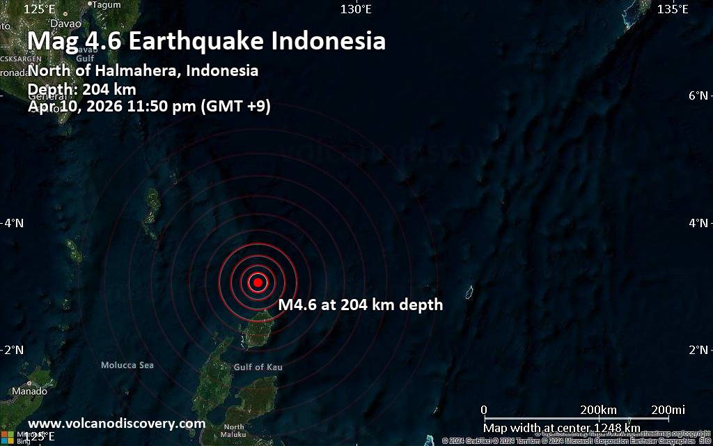Earthquake data: Date & time: Apr 10, 2026 11:50 pm (GMT +9) local time (10 Apr 2026 14:50 GMT)Magnitude: 4.6 Depth: 204.00 km Epicenter latitude / longitude: 3.06°N / 128.45°E  ( North Maluku, Indonesia) Primary data source: BMKGhttps://www.volcanodiscovery.com/earthquake/news/299683/Moderate-magnitude-46-earthquake-114-km-north-of-Daruba-Indonesia.html