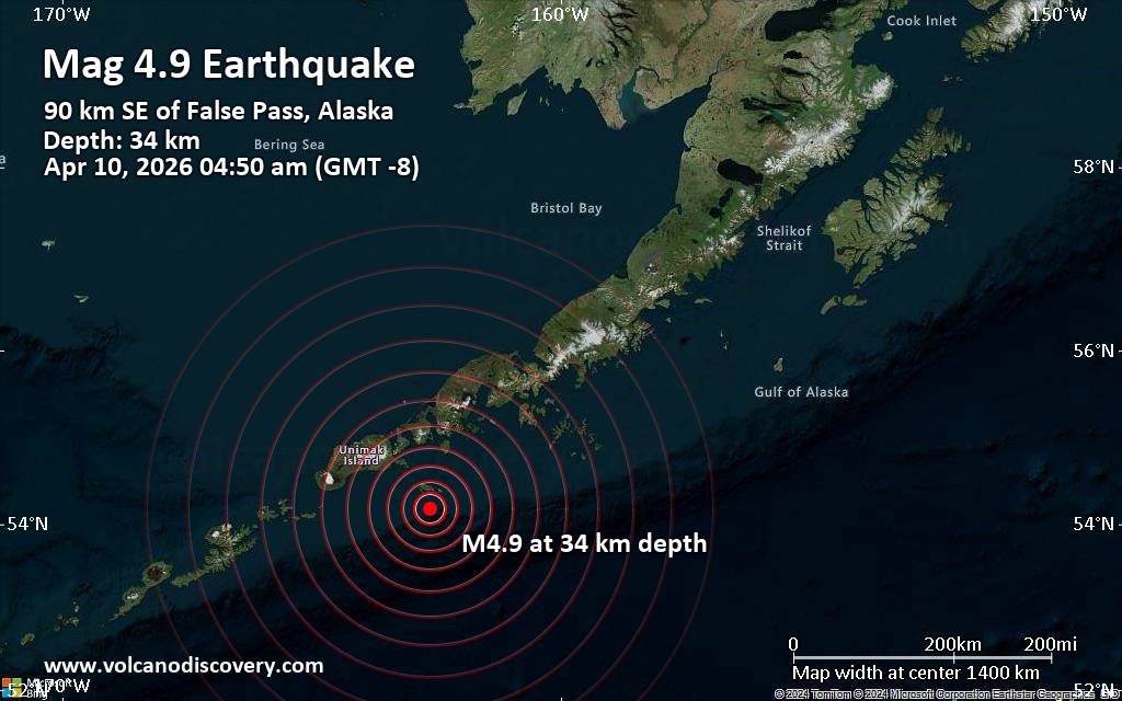 Moderate earthquake of magnitude 4.9 just reported 62 miles south of King Cove, Alaska, United States An earthquake of magnitude 4.9 occurred only 19 minutes ago 62 miles south of King Cove, Alaska, United States, the United States Geological Survey reported. The quake hit at a moderately shallow depth of 21 miles beneath the epicenter near King Cove, Aleutians East, Alaska, USA, early morning on Friday, April 10th, 2026, at 4:50 am local time. The exact magnitude, epicenter, and depth of the quake might be revised within the next few hours or minutes as seismologists review data and refine their calculations, or as other agencies issue their report. Our monitoring service identified a second report from The Incorporated Research Institutions for Seismology (IRIS) which listed the quake at magnitude 4.9 as well. Other agencies reporting the same quake include the European-Mediterranean Seismological Centre (EMSC) at magnitude 4.9, and the German Research Centre for Geosciences (GFZ) at magnitude 4.8. Based on the preliminary seismic data, the quake should not have caused any significant damage, but was probably felt by many people as light vibration in the area of the epicenter. Weak shaking might have been felt in False Pass (pop. 40) located 56 miles from the epicenter, and King Cove (pop. 1000) 62 miles away. Other towns or cities near the epicenter where the quake might have been felt as very weak shaking include Cold Bay (pop. 120) located 69 miles from the epicenter. VolcanoDiscovery will automatically update magnitude and depth if these change and follow up if other significant news about the quake become available. If you’re in the area, please send us your experience through our reporting mechanism, either online or via our mobile app. This will help us provide more first-hand updates to anyone around the globe who wants to know more about this quake.