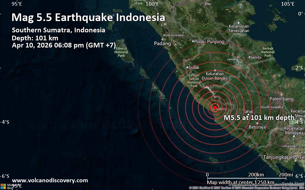 Earthquake data: Date & time: Apr 10, 2026 06:08 pm (GMT +7) local time (10 Apr 2026 11:08 GMT)Magnitude: 5.5 Depth: 101.00 km Epicenter latitude / longitude: 3.47°S / 102.3°E  ( Kabupaten Bengkulu Utara, Bengkulu, Indonesia) Primary data source: BMKGhttps://www.volcanodiscovery.com/earthquake/news/299671/Moderate-yet-deep-55-quake-hits-near-Bengkulu-Kota-Bengkulu-Indonesia.html