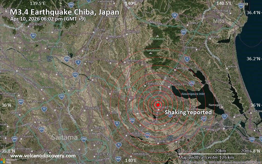 Seismic-like event, possible earthquake, reported few minutes ago near Mobara, Chiba, Japan Unconfirmed quake or seismic-like event reported: Chiba, 3.9 km north of Ushiku, Ibaraki, Japan, 4 minutes ago We are receiving unverified early reports of ground shaking possibly caused by seismic activity in or near Mobara, Chiba, Japan on 10 Apr 2026 (GMT) at approximately 09:02 GMT. There are no details yet on the magnitude or depth of this possible quake. If confirmed, we can expect more accurate data to emerge in the next few minutes. The location, magnitude and time mentioned are indicative, based on our best-fit seismic model. They are temporary until our AllQuakes monitoring service receives more exact scientific data from a national or international seismological agency. Check back here shortly and stay safe.