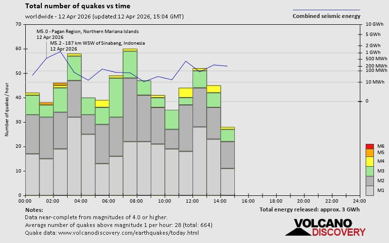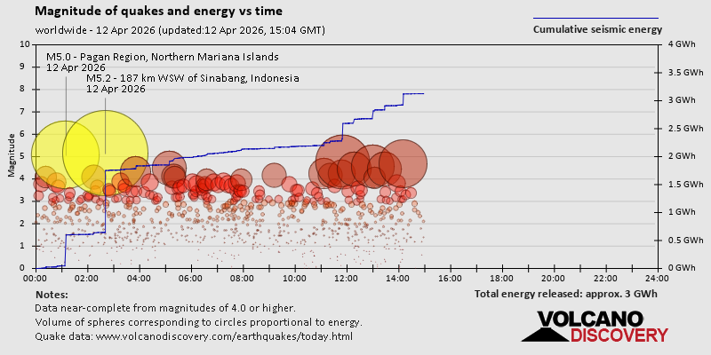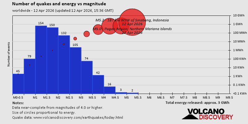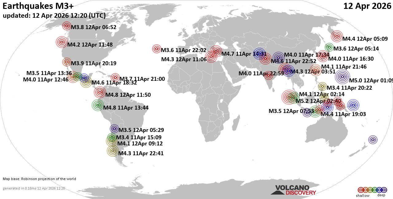 World Earthquake Report for Sunday, 12 April 2026 Worldwide earthquakes above magnitude 3 during the past 24 hours on 12 Apr 2026 Summary: 2 quakes 5.0+, 31 quakes 4.0+, 157 quakes 3.0+, 415 quakes 2.0+ (605 total)This report is being updated every hour.Magnitude 5+: 2 earthquakes Magnitude 4+: 31 earthquakes Magnitude 3+: 157 earthquakes Magnitude 2+: 415 earthquakes No quakes of magnitude 6 or higher 10 largest earthquakes in the world (past 24 hours)Sunday, Apr 12, 2026, at 08:40 am (GMT +6) - Sunday, Apr 12, 2026, at 11:09 am (GMT +10) - Sunday, Apr 12, 2026, at 06:50 am (GMT -5) - Saturday, Apr 11, 2026, at 08:44 am (GMT -5) - Saturday, Apr 11, 2026, at 05:31 pm (GMT +3) - Saturday, Apr 11, 2026, at 12:32 pm (GMT -6) - Sunday, Apr 12, 2026, at 04:22 am (GMT +5:30) - Sunday, Apr 12, 2026, at 05:21 am (GMT +8) - Sunday, Apr 12, 2026, at 04:29 am (GMT +4:30) - Sunday, Apr 12, 2026, at 05:09 pm (Kamchatka time) - Earthquakes reported feltSunday, Apr 12, 2026, at 09:21 am (GMT +5:30) - Saturday, Apr 11, 2026, at 05:31 pm (GMT +3) - Saturday, Apr 11, 2026, at 06:41 pm (GMT -4) - Saturday, Apr 11, 2026, at 09:53 pm (GMT -6) - Sunday, Apr 12, 2026, at 04:22 am (GMT +5:30) - Sunday, Apr 12, 2026, at 04:37 am (Kolkata time) - Sunday, Apr 12, 2026, at 04:00 am (GMT -4) - Saturday, Apr 11, 2026, at 10:01 pm (GMT -6) - Sunday, Apr 12, 2026, at 09:34 am (GMT +3) - Sunday, Apr 12, 2026, at 08:40 am (GMT +6) - Saturday, Apr 11, 2026, at 12:32 pm (GMT -6) - Sunday, Apr 12, 2026, at 03:03 am (GMT +8) - Saturday, Apr 11, 2026, at 08:44 am (GMT -5) - Saturday, Apr 11, 2026, at 05:00 pm (GMT -4) - Sunday, Apr 12, 2026, at 12:51 am (Kolkata time) - Saturday, Apr 11, 2026, at 11:12 am (GMT -7) - Sunday, Apr 12, 2026, at 04:12 am (GMT -7) - Saturday, Apr 11, 2026, at 07:11 pm (GMT +3) - Sunday, Apr 12, 2026, at 05:12 am (GMT -4) - Saturday, Apr 11, 2026, at 05:42 pm (GMT +3) - Earthquake stats  https://www.volcanodiscovery.com/earthquake/news/299788/World-Earthquake-Report-for-Sunday-12-April-2026.html