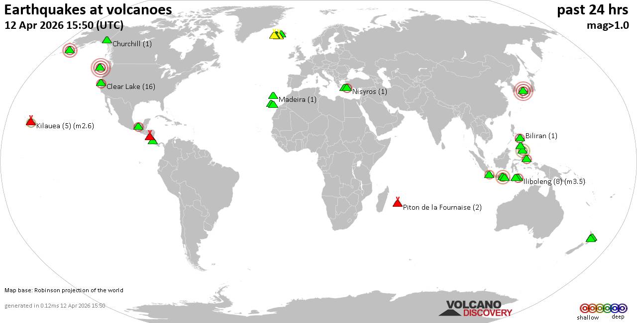 Volcano earthquake report for Sunday, 12 Apr 2026 World map showing volcanoes with shallow (less than 50 km) earthquakes within 20 km radius during the past 24 hours on 12 Apr 2026 Number in brackets indicate nr of quakes. Quakes detected near: Baluran (2 quakes between mag 2.8-3.2), Bardarbunga (4 quakes between mag 1.1-1.6), Barva (4 quakes between mag 1.8-2.7), Biliran (1 quake mag 2.5), Brennisteinsfjöll (3 quakes between mag 0.2-1.1), Churchill (1 quake mag 1.0) Clear Lake (17 quakes between mag 0.4-2.3), Cobb Segment (5 quakes between mag 2.9-3.7), El Chichón (2 quakes between mag 2.3-2.4), Etna (1 quake mag 1.1), Eyafjallajökull (1 quake mag 1.5), Gagak (1 quake mag 2.1), Grímsnes (14 quakes between mag 0.0-1.6), Hekla (1 quake mag 1.0), Iliboleng (8 quakes between mag 2.1-3.5), Jailolo (2 quakes between mag 2.1-2.2), Katla (10 quakes between mag 0.0-1.4), Kilauea (5 quakes between mag 1.7-2.6), Kolumbo (1 quake mag 1.2), La Palma (1 quake mag 1.8), Latukan (2 quakes between mag 1.6-2.2), Madeira (1 quake mag 1.4), Mammoth Mountain (1 quake mag 1.3), Maroa (5 quakes between mag 1.6-2.4), Masaya (6 quakes between mag 1.1-3.1), Nisyros (1 quake mag 2.0), Okataina (Tarawera) (1 quake mag 2.5), Piton de la Fournaise (3 quakes between mag 0.3-1.5), Sanbe (1 quake mag 4.0), Svartsengi (1 quake mag 1.0), Tenerife (11 quakes between mag 1.0-2.0), Tjörnes Fracture Zone (3 quakes between mag 0.6-1.4), Torfajökull (3 quakes between mag 0.9-1.0) (updated 11h50) Note: Earthquakes within 20 km from and at depths less than 50 km under active volcanoes are reported. The list is not complete because many volcanoes are not monitored and/or seismic data in high resolution is not available publicly.