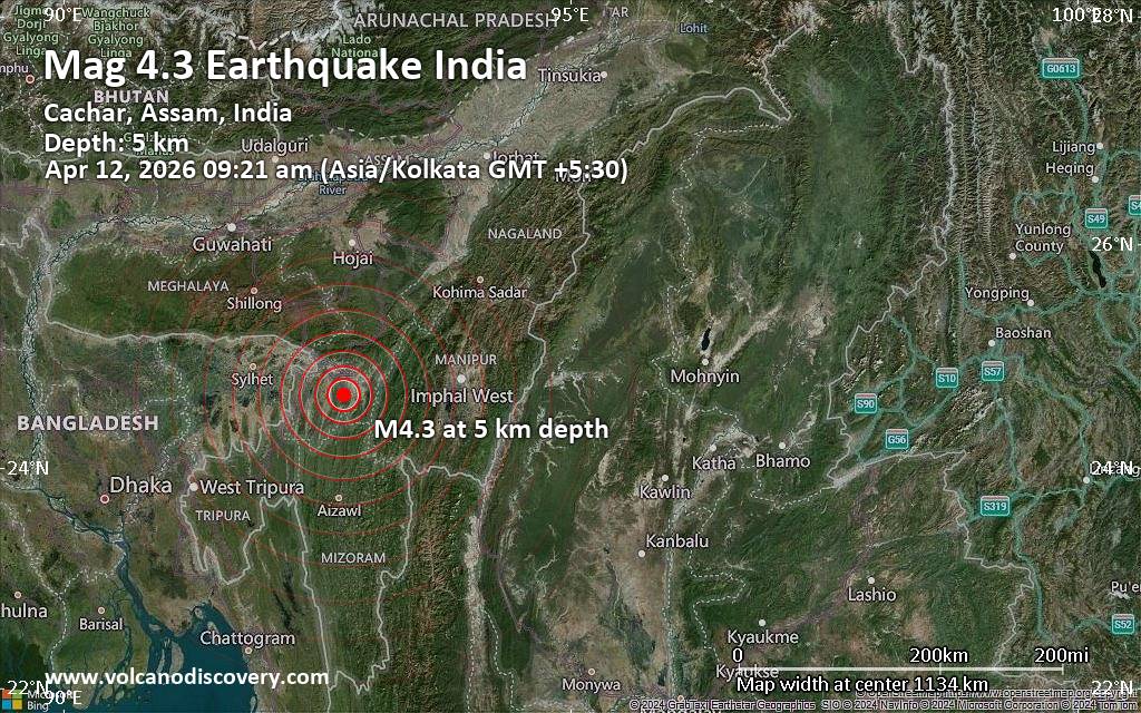 Moderate 4.3 quake hits near Silchar, Cachar, Assam, India An earthquake of magnitude 4.3 occurred only 20 minutes ago 19 km south of Silchar, India, India's National Center for Seismology (NCS) reported. The quake hit at a very shallow depth of 5. km beneath the epicenter near Silchar, Cachar, Assam, India, in the morning on Sunday, April 12th, 2026, at 8:51 am local time. The exact magnitude, epicenter, and depth of the quake might be revised within the next few hours or minutes as seismologists review data and refine their calculations, or as other agencies issue their report. Based on the preliminary seismic data, the quake was probably felt by many people in the area of the epicenter. It should not have caused significant damage, other than objects falling from shelves, broken windows, etc. In Irongmara (pop. 7,700) located 4 km from the epicenter, the quake should have been felt as light shaking. Weak shaking might have been felt in Ambikapur Part-X (pop. 14,300) located 16 km from the epicenter, Ambicapur Pt VIII (pop. 11,700) 18 km away, Silchar (pop. 178,900) 19 km away, Hailakandi (pop. 33,600) 21 km away, Karimganj (pop. 56,900) 47 km away, and Kolasib (pop. 25,000) 49 km away. Other towns or cities near the epicenter where the quake might have been felt as very weak shaking include Haflong (pop. 43,800) located 62 km from the epicenter, and Aizawl (pop. 293,400) 104 km away. VolcanoDiscovery will automatically update magnitude and depth if these change and follow up if other significant news about the quake become available. If you’re in the area, please send us your experience through our reporting mechanism, either online or via our mobile app. This will help us provide more first-hand updates to anyone around the globe who wants to know more about this quake.