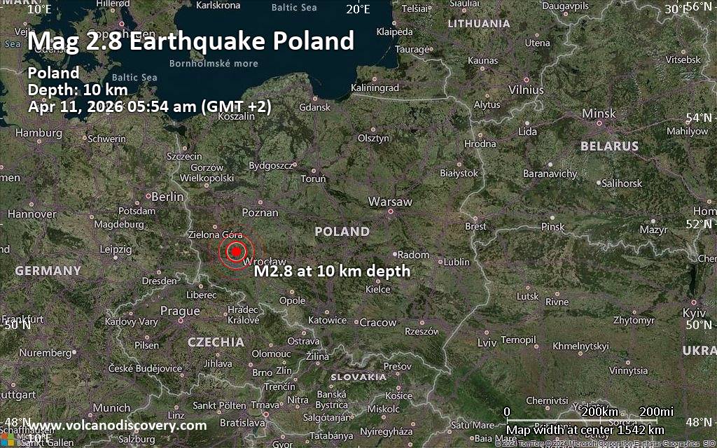 Earthquake data: Date & time: Apr 11, 2026 05:54 am (GMT +2) local time (11 Apr 2026 03:54 GMT)Magnitude: 2.8 Depth: 10.00 km Epicenter latitude / longitude: 51.47°N / 16.17°E  ( Poland) Primary data source: GFZhttps://www.volcanodiscovery.com/earthquake/news/299723/Small-tremor-of-magnitude-28-just-reported-7-km-northwest-of-Lubin-Poland.html