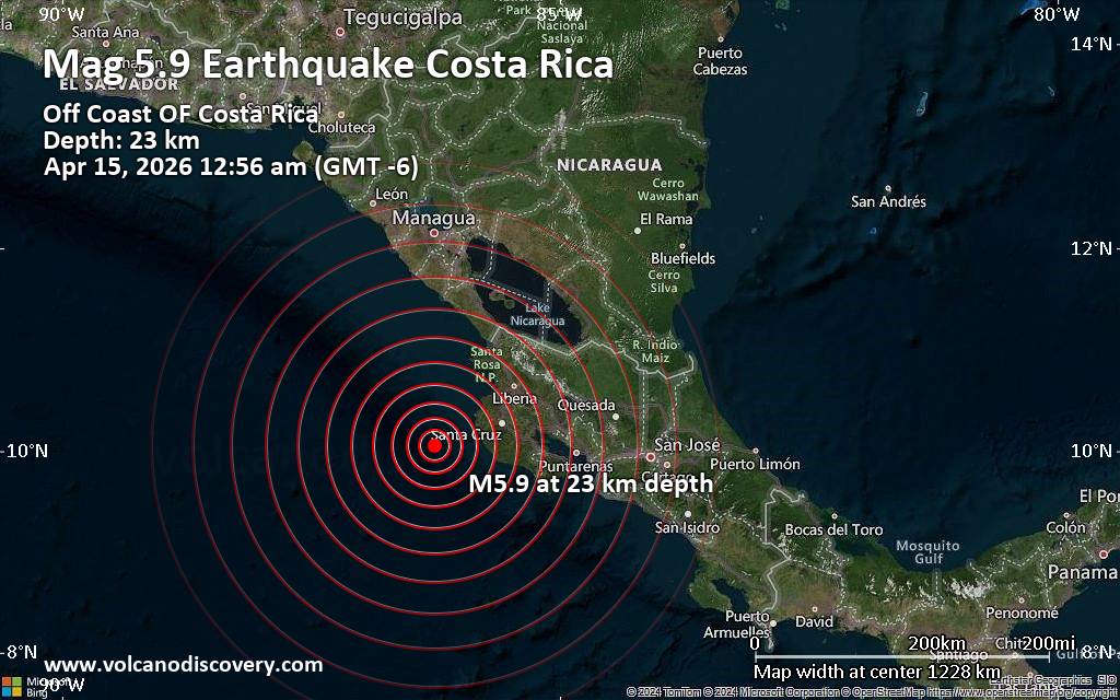 Magnitude 5.9 earthquake strikes near Nicoya, Provincia de Guanacaste, Costa Rica Just 13 minutes ago, a 5.9-magnitude earthquake struck near Nicoya, Provincia de Guanacaste, Costa Rica. The tremor was recorded after midnight on Wednesday, April 15th, 2026, at 12:56 am local time, at a shallow depth of 23. km below the surface. The event was filed by the European-Mediterranean Seismological Centre (EMSC), the first seismological agency to report it. A second report was later issued by the German Research Centre for Geosciences (GFZ), which listed it as a magnitude 5.9 earthquake as well. A third agency, France's Réseau National de Surveillance Sismique (RéNaSS), reported the same quake at magnitude 5.1. Based on the preliminary seismic data, the quake was probably felt by many people in the area of the epicenter. It should not have caused significant damage, other than objects falling from shelves, broken windows, etc. In Tamarindo (pop. 6,400) located 53 km from the epicenter, Santa Cruz (pop. 12,300) 77 km away, Nicoya (pop. 15,300) 89 km away, and Liberia (pop. 45,400) 111 km away, the quake should have been felt as light shaking. VolcanoDiscovery will automatically update magnitude and depth if these change and follow up if other significant news about the quake become available. If you’re in the area, please send us your experience through our reporting mechanism, either online or via our mobile app. This will help us provide more first-hand updates to anyone around the globe who wants to know more about this quake.