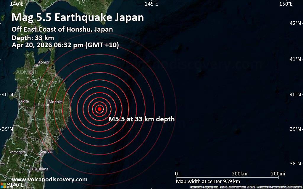 Significant 5.5 quake hits near Miyako, Miyako Shi, Iwate, Japan Just 15 minutes ago, a 5.5-magnitude earthquake struck near Miyako, Miyako Shi, Iwate, Japan. The tremor was recorded early evening on Monday, April 20th, 2026, at 6:32 pm local time, at a moderately shallow depth of 33. km below the surface. The event was filed by Indonesia's Meteorology, Climatology, and Geophysical Agency, the first seismological agency to report it. Our monitoring service identified a second report from France's Réseau National de Surveillance Sismique (RéNaSS) which listed the quake at magnitude 5.3. Based on the preliminary seismic data, the quake should not have caused any significant damage, but was probably felt by many people as light vibration in the area of the epicenter. Weak shaking might have been felt in Yamada (pop. 15,200) located 97 km from the epicenter, Miyako (pop. 51,200) 97 km away, and Kamaishi (pop. 43,100) 109 km away. VolcanoDiscovery will automatically update magnitude and depth if these change and follow up if other significant news about the quake become available. If you’re in the area, please send us your experience through our reporting mechanism, either online or via our mobile app. This will help us provide more first-hand updates to anyone around the globe who wants to know more about this quake.
