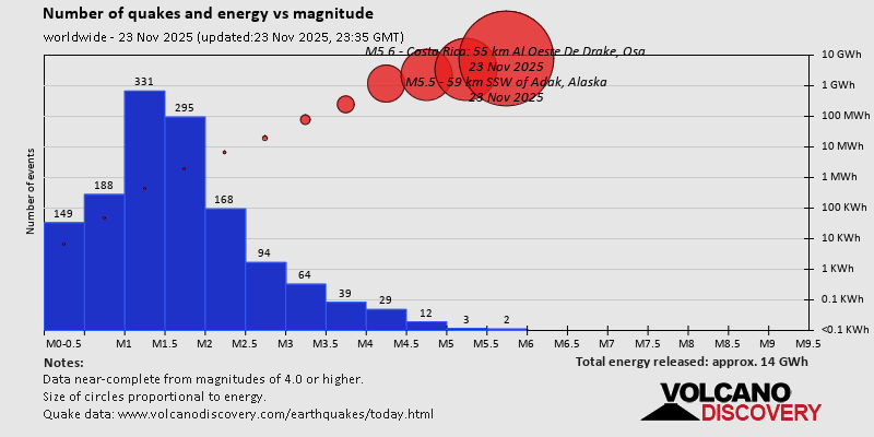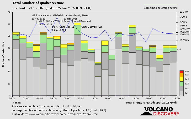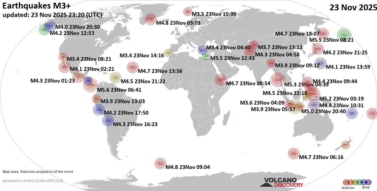 World Earthquake Report for Sunday, 23 November 2025 Worldwide earthquakes above magnitude 3 during the past 24 hours on 23 Nov 2025 Summary: 5 quakes 5.0+, 43 quakes 4.0+, 107 quakes 3.0+, 267 quakes 2.0+ (422 total)Magnitude 5+: 5 earthquakes Magnitude 4+: 43 earthquakes Magnitude 3+: 107 earthquakes Magnitude 2+: 267 earthquakes No quakes of magnitude 6 or higher 10 largest earthquakes in the world (past 24 hours)Sunday, Nov 23, 2025, at 12:41 am (GMT -6) - Saturday, Nov 22, 2025, at 10:21 pm (GMT -10) - Sunday, Nov 23, 2025, at 10:09 am (GMT +5:30) - Sunday, Nov 23, 2025, at 12:19 pm (Jayapura time) - Monday, Nov 24, 2025, at 03:40 am (GMT +7) - Sunday, Nov 23, 2025, at 12:32 pm (GMT +13) - Sunday, Nov 23, 2025, at 07:04 am (GMT -2) - Sunday, Nov 23, 2025, at 01:03 am (Nuuk time) - Sunday, Nov 23, 2025, at 12:19 pm (Jayapura time) - Sunday, Nov 23, 2025, at 02:16 pm (GMT +8) - Earthquakes reported feltSunday, Nov 23, 2025, at 05:22 pm (GMT -4) - Sunday, Nov 23, 2025, at 10:09 am (GMT +5:30) - Sunday, Nov 23, 2025, at 05:44 pm (GMT +8) - Sunday, Nov 23, 2025, at 07:58 am (GMT -8) - Sunday, Nov 23, 2025, at 12:41 am (GMT -6) - Sunday, Nov 23, 2025, at 12:50 pm (GMT -5) - Sunday, Nov 23, 2025, at 06:12 pm (GMT +5) - Monday, Nov 24, 2025, at 03:40 am (GMT +7) - Sunday, Nov 23, 2025, at 01:16 pm (GMT -1) - Sunday, Nov 23, 2025, at 11:54 am (GMT +3) - Sunday, Nov 23, 2025, at 10:33 am (GMT +1) - Saturday, Nov 22, 2025, at 11:33 pm (GMT -6) - Sunday, Nov 23, 2025, at 06:27 pm (GMT +11) - Sunday, Nov 23, 2025, at 11:45 am (Kamchatka time) - Sunday, Nov 23, 2025, at 05:28 pm (GMT +5:30) - Sunday, Nov 23, 2025, at 06:37 am (GMT -5) - Sunday, Nov 23, 2025, at 04:38 pm (GMT +11) - Sunday, Nov 23, 2025, at 01:42 pm (GMT +6:30) - Sunday, Nov 23, 2025, at 01:57 pm (GMT +8) - Sunday, Nov 23, 2025, at 01:09 pm (GMT -9) - Sunday, Nov 23, 2025, at 12:19 pm (Jayapura time) - Sunday, Nov 23, 2025, at 11:09 am (GMT +7) - Earthquake stats  https://www.volcanodiscovery.com/earthquake/news/287605/World-Earthquake-Report-for-Sunday-23-November-2025.html