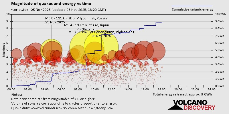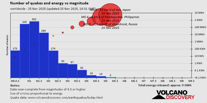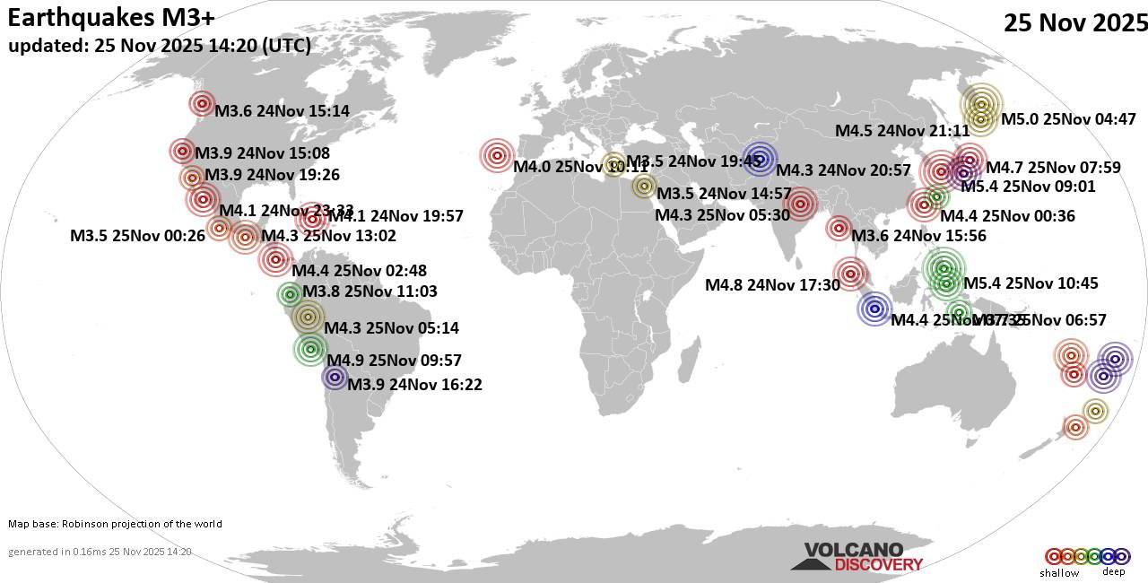 World Earthquake Report for Tuesday, 25 November 2025 Worldwide earthquakes above magnitude 3 during the past 24 hours on 25 Nov 2025 Summary: 3 quakes 5.0+, 36 quakes 4.0+, 175 quakes 3.0+, 337 quakes 2.0+ (551 total)This report is being updated every hour.Magnitude 5+: 3 earthquakes Magnitude 4+: 36 earthquakes Magnitude 3+: 175 earthquakes Magnitude 2+: 337 earthquakes No quakes of magnitude 6 or higher 10 largest earthquakes in the world (past 24 hours)Tuesday, Nov 25, 2025, at 06:01 pm (GMT +9) - Tuesday, Nov 25, 2025, at 06:45 pm (GMT +8) - Tuesday, Nov 25, 2025, at 03:47 pm (GMT +11) - Tuesday, Nov 25, 2025, at 03:53 pm (GMT +11) - Tuesday, Nov 25, 2025, at 04:57 am (GMT -5) - Tuesday, Nov 25, 2025, at 01:54 pm (GMT +11) - Tuesday, Nov 25, 2025, at 12:30 am (GMT +7) - Tuesday, Nov 25, 2025, at 04:59 pm (GMT +9) - Monday, Nov 24, 2025, at 10:29 am (GMT -12) - Monday, Nov 24, 2025, at 11:13 pm (GMT -3) - Earthquakes reported feltTuesday, Nov 25, 2025, at 06:45 pm (GMT +8) - Tuesday, Nov 25, 2025, at 06:01 pm (GMT +9) - Monday, Nov 24, 2025, at 09:02 am (GMT -7) - Tuesday, Nov 25, 2025, at 11:03 am (GMT +2) - Tuesday, Nov 25, 2025, at 02:35 am (GMT +1) - Tuesday, Nov 25, 2025, at 03:47 pm (GMT +11) - Monday, Nov 24, 2025, at 07:08 am (GMT -8) - Tuesday, Nov 25, 2025, at 03:53 pm (GMT +11) - Monday, Nov 24, 2025, at 08:48 pm (GMT -6) - Tuesday, Nov 25, 2025, at 06:15 pm (GMT +9) - Monday, Nov 24, 2025, at 11:30 am (GMT -5) - Tuesday, Nov 25, 2025, at 04:59 pm (GMT +9) - Monday, Nov 24, 2025, at 09:10 pm (GMT -6) - Monday, Nov 24, 2025, at 08:54 pm (GMT -6) - Tuesday, Nov 25, 2025, at 09:59 pm (GMT +9) - Tuesday, Nov 25, 2025, at 06:05 pm (GMT +9) - Tuesday, Nov 25, 2025, at 06:02 pm (GMT +9) - Tuesday, Nov 25, 2025, at 06:30 pm (GMT +8) - Tuesday, Nov 25, 2025, at 03:43 pm (Kamchatka time) - Monday, Nov 24, 2025, at 09:04 pm (GMT -6) - Tuesday, Nov 25, 2025, at 12:57 am (GMT -6) - Tuesday, Nov 25, 2025, at 12:02 am (Istanbul time) - Monday, Nov 24, 2025, at 07:59 am (GMT -8) - Tuesday, Nov 25, 2025, at 04:14 am (GMT +8) - Monday, Nov 24, 2025, at 09:45 pm (GMT +2) - Earthquake stats  https://www.volcanodiscovery.com/earthquake/news/287745/World-Earthquake-Report-for-Tuesday-25-November-2025.html