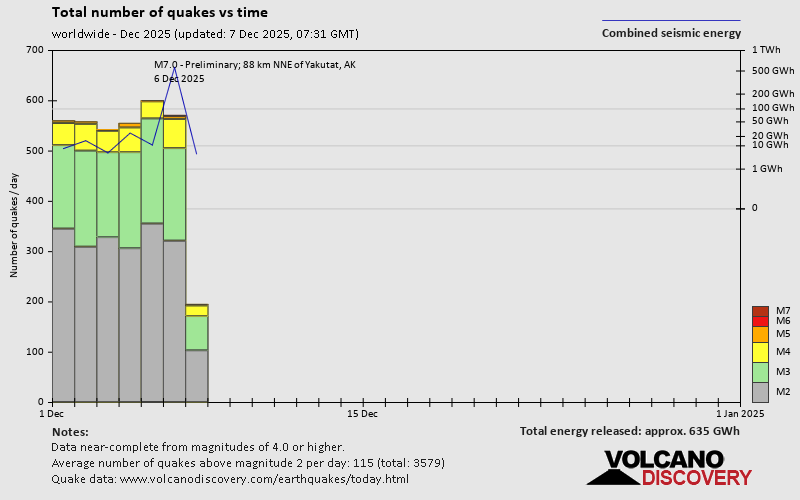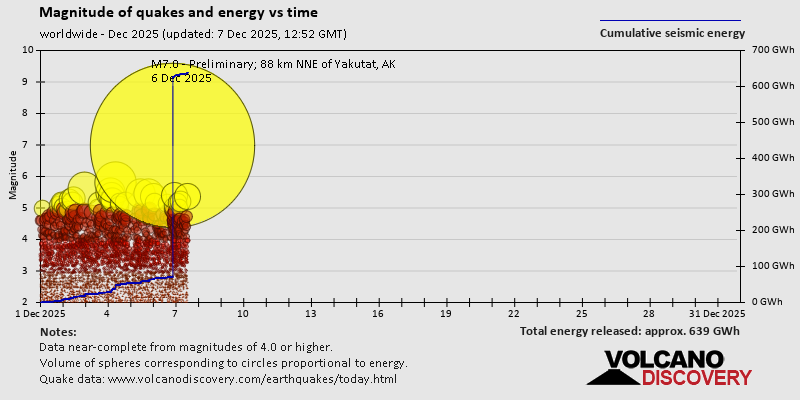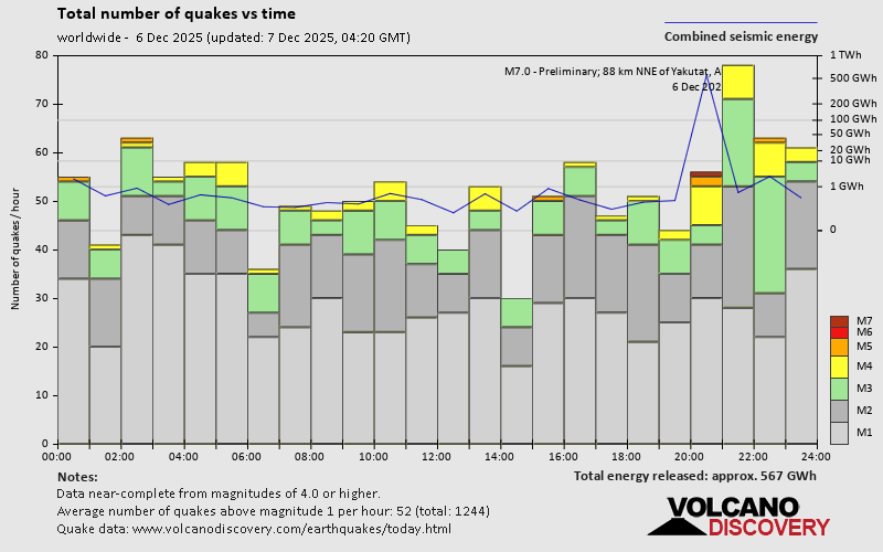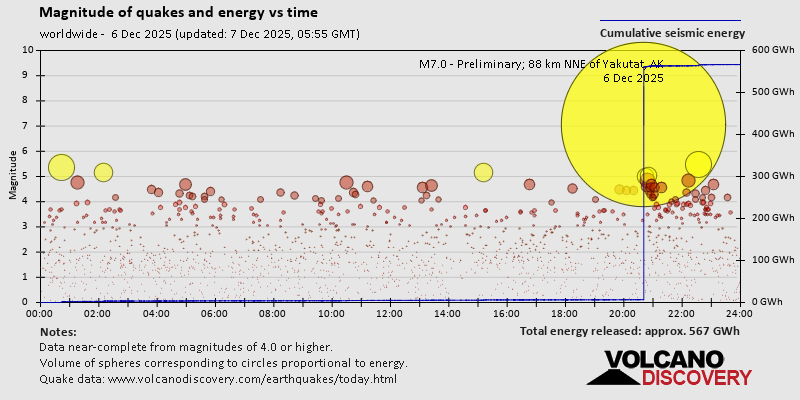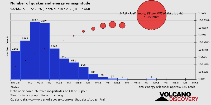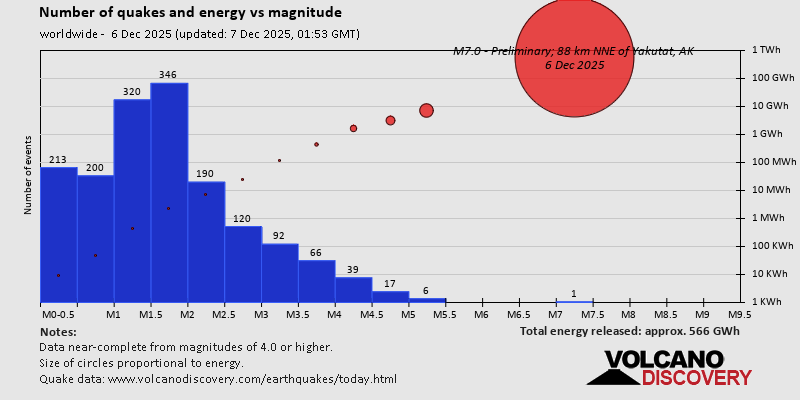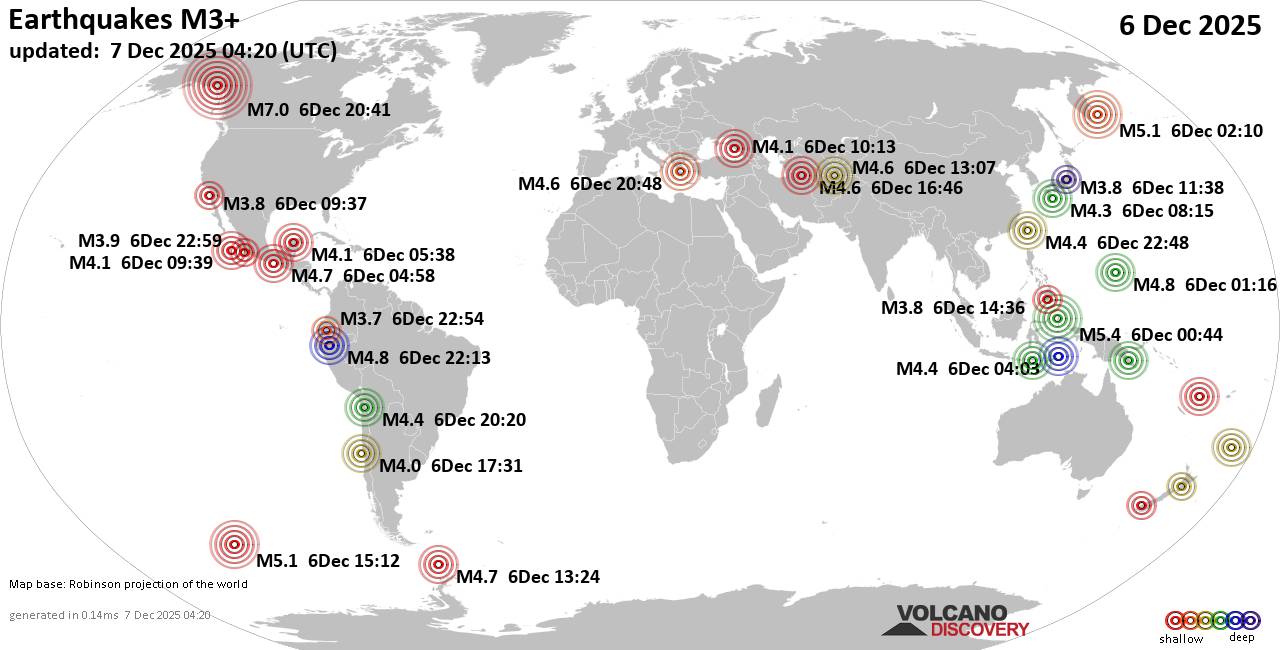 World Earthquake Report for Saturday, 6 December 2025 Worldwide earthquakes above magnitude 3 during the past 24 hours on 7 Dec 2025 Summary: 1 quake 7.0+, 6 quakes 5.0+, 59 quakes 4.0+, 180 quakes 3.0+, 319 quakes 2.0+ (565 total)Magnitude 7+: 1 earthquake Magnitude 5+: 6 earthquakes Magnitude 4+: 59 earthquakes Magnitude 3+: 180 earthquakes Magnitude 2+: 319 earthquakes No quakes of magnitude 6 or higher 10 largest earthquakes in the world (6 Dec 2025)Saturday, Dec 6, 2025, at 11:41 am (Yakutat time) - Saturday, Dec 6, 2025, at 09:44 am (GMT +9) - Saturday, Dec 6, 2025, at 03:34 pm (Whitehorse time) - Saturday, Dec 6, 2025, at 02:10 pm (GMT +12) - Saturday, Dec 6, 2025, at 07:12 am (GMT -8) - Saturday, Dec 6, 2025, at 11:46 am (Yakutat time) - Saturday, Dec 6, 2025, at 11:51 am (Yakutat time) - Saturday, Dec 6, 2025, at 01:49 pm (Whitehorse time) - Saturday, Dec 6, 2025, at 10:31 pm (GMT +12) - Saturday, Dec 6, 2025, at 05:13 pm (Lima time) - Earthquakes reported feltSaturday, Dec 6, 2025, at 10:48 pm (Athens time) - Saturday, Dec 6, 2025, at 11:41 am (Yakutat time) - Saturday, Dec 6, 2025, at 10:26 pm (GMT +1) - Saturday, Dec 6, 2025, at 05:54 pm (Guayaquil time) - Saturday, Dec 6, 2025, at 11:01 pm (GMT +1) - Saturday, Dec 6, 2025, at 10:49 pm (Athens time) - Saturday, Dec 6, 2025, at 01:13 pm (Moscow time) - Saturday, Dec 6, 2025, at 08:43 pm (GMT +2) - Saturday, Dec 6, 2025, at 11:16 am (Guam time) - Saturday, Dec 6, 2025, at 11:46 am (Yakutat time) - Saturday, Dec 6, 2025, at 11:51 am (Yakutat time) - Friday, Dec 5, 2025, at 04:34 pm (GMT -8) - Saturday, Dec 6, 2025, at 02:28 am (GMT +0) - Saturday, Dec 6, 2025, at 10:51 pm (GMT +2) - Saturday, Dec 6, 2025, at 02:04 pm (Whitehorse time) - Saturday, Dec 6, 2025, at 05:37 pm (GMT +4:30) - Saturday, Dec 6, 2025, at 06:47 am (GMT +2) - Sunday, Dec 7, 2025, at 05:51 am (Port Moresby time) - Friday, Dec 5, 2025, at 10:58 pm (GMT -6) - Saturday, Dec 6, 2025, at 07:20 am (Athens time) - Saturday, Dec 6, 2025, at 05:20 pm (Santiago time) - Sunday, Dec 7, 2025, at 12:10 am (Karachi time) - Saturday, Dec 6, 2025, at 04:40 pm (Lima time) - Saturday, Dec 6, 2025, at 09:25 am (Bucharest time) - Saturday, Dec 6, 2025, at 12:03 pm (GMT -9) - Saturday, Dec 6, 2025, at 05:15 pm (GMT +9) - Friday, Dec 5, 2025, at 11:38 pm (Merida time) - Saturday, Dec 6, 2025, at 11:48 pm (GMT +8) - Friday, Dec 5, 2025, at 08:09 pm (GMT -6) - Earthquake stats  https://www.volcanodiscovery.com/earthquake/news/288798/World-Earthquake-Report-for-Saturday-6-December-2025.html