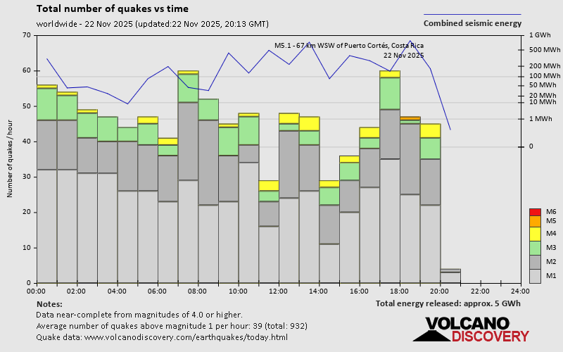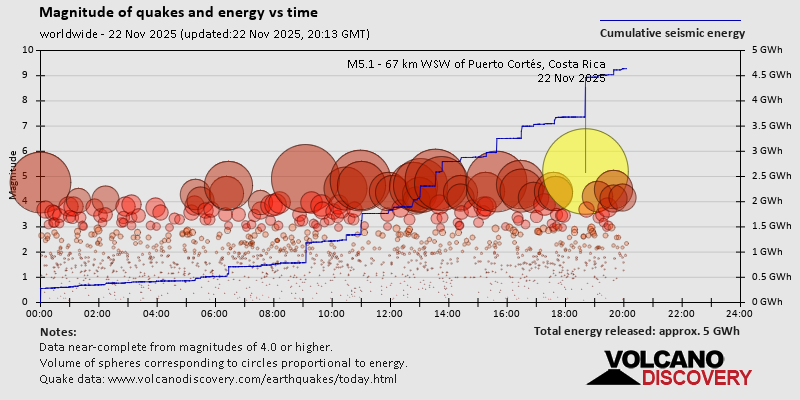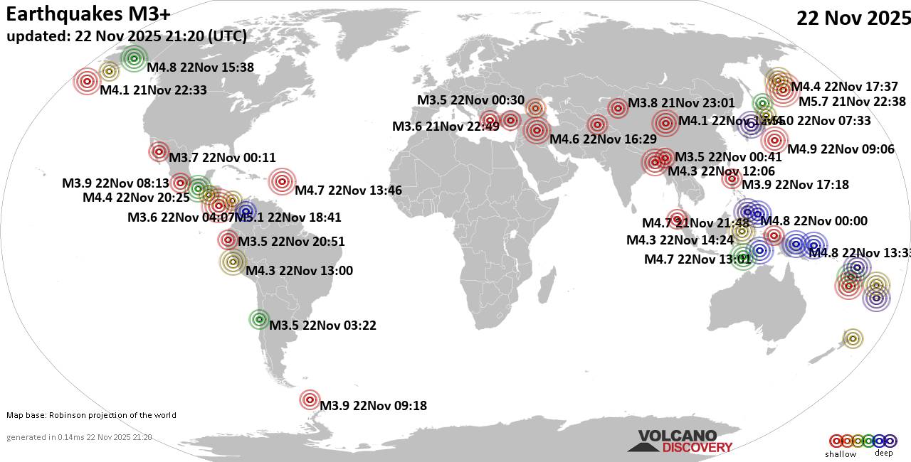 World Earthquake Report for Saturday, 22 November 2025 Worldwide earthquakes above magnitude 3 during the past 24 hours on 22 Nov 2025 Summary: 2 quakes 5.0+, 40 quakes 4.0+, 134 quakes 3.0+, 318 quakes 2.0+ (494 total)This report is being updated every hour.Magnitude 5+: 2 earthquakes Magnitude 4+: 40 earthquakes Magnitude 3+: 134 earthquakes Magnitude 2+: 318 earthquakes No quakes of magnitude 6 or higher 10 largest earthquakes in the world (past 24 hours)Saturday, Nov 22, 2025, at 09:38 am (GMT +11) - Saturday, Nov 22, 2025, at 12:41 pm (GMT -6) - Saturday, Nov 22, 2025, at 06:06 pm (GMT +9) - Saturday, Nov 22, 2025, at 11:33 pm (Port Moresby time) - Saturday, Nov 22, 2025, at 06:38 am (Anchorage time) - Saturday, Nov 22, 2025, at 08:00 am (Manila time) - Saturday, Nov 22, 2025, at 07:00 pm (GMT +8) - Sunday, Nov 23, 2025, at 05:11 am (Port Moresby time) - Saturday, Nov 22, 2025, at 09:46 am (GMT -4) - Saturday, Nov 22, 2025, at 06:48 am (GMT +9) - Earthquakes reported feltSaturday, Nov 22, 2025, at 06:06 pm (GMT +6) - Saturday, Nov 22, 2025, at 06:38 am (Anchorage time) - Saturday, Nov 22, 2025, at 10:36 am (GMT +6) - Saturday, Nov 22, 2025, at 12:41 pm (GMT -6) - Saturday, Nov 22, 2025, at 06:55 pm (GMT +1) - Saturday, Nov 22, 2025, at 06:36 am (GMT -9) - Friday, Nov 21, 2025, at 11:30 pm (GMT -6) - Saturday, Nov 22, 2025, at 07:29 pm (Baghdad time) - Sunday, Nov 23, 2025, at 01:18 am (Manila time) - Saturday, Nov 22, 2025, at 08:00 am (Manila time) - Saturday, Nov 22, 2025, at 04:08 am (GMT +2) - Saturday, Nov 22, 2025, at 11:56 am (GMT -6) - Saturday, Nov 22, 2025, at 11:31 pm (GMT +6:30) - Saturday, Nov 22, 2025, at 02:18 pm (GMT -5) - Saturday, Nov 22, 2025, at 01:39 pm (Costa Rica time) - Saturday, Nov 22, 2025, at 08:47 am (GMT +2) - Saturday, Nov 22, 2025, at 02:47 pm (GMT +1) - Saturday, Nov 22, 2025, at 12:34 am (GMT +3) - Saturday, Nov 22, 2025, at 04:29 am (Costa Rica time) - Saturday, Nov 22, 2025, at 04:24 am (Universal Time) - Saturday, Nov 22, 2025, at 09:38 am (GMT +11) - Saturday, Nov 22, 2025, at 07:42 pm (GMT +2) - Saturday, Nov 22, 2025, at 01:27 pm (GMT -6) - Saturday, Nov 22, 2025, at 06:48 am (GMT +9) - Saturday, Nov 22, 2025, at 01:57 pm (GMT -6) - Sunday, Nov 23, 2025, at 03:02 am (GMT +13) - Earthquake stats  https://www.volcanodiscovery.com/earthquake/news/287508/World-Earthquake-Report-for-Saturday-22-November-2025.html