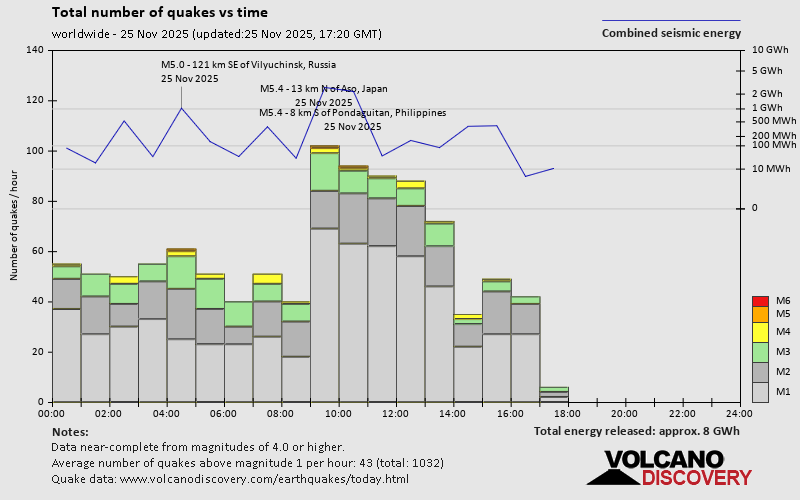 Volcano earthquake report for Tuesday, 25 Nov 2025 World map showing volcanoes with shallow (less than 50 km) earthquakes within 20 km radius during the past 24 hours on 25 Nov 2025 Number in brackets indicate nr of quakes. Quakes detected near: Akuseki-jima (3 quakes between mag 1.3-1.7), Aso (257 quakes between mag 0.1-4.3), Bulusan (2 quakes between mag 2.6-3.2), Buzzard Creek (2 quakes between mag 2.2-2.4), Clear Lake (29 quakes between mag 0.2-1.9), Cleveland (1 quake mag 1.6) Coso (1 quake mag 1.5), El Chichón (6 quakes between mag 2.0-3.0), Etna (3 quakes between mag 1.3-1.7), Geureudong (5 quakes between mag 2.9-4.8), Golden Trout Creek (1 quake mag 1.9), Hakkoda (8 quakes between mag 0.1-2.5), Katla (6 quakes between mag 0.4-1.5), Kilauea (4 quakes between mag 1.4-2.0), Kirishima (13 quakes between mag 0.2-1.8), Kuju (11 quakes between mag 0.5-5.4), Kurikoma (4 quakes between mag 0.4-1.1), Ljósufjöll (3 quakes between mag 1.0-1.9), Loki-Fögrufjöll volcano (2 quakes between mag 0.3-1.3), Methana (1 quake mag 1.5), Miravalles (1 quake mag 1.8), Poas (1 quake mag 3.0), Ruapehu (4 quakes between mag 0.7-1.8), Shishaldin (6 quakes between mag 1.1-1.5), Sousaki (1 quake mag 1.7), Spurr (1 quake mag 2.1), Takahara (2 quakes between mag 0.8-1.0), Talakmau (1 quake mag 2.6), Tambora (1 quake mag 2.3), Terceira (1 quake mag 2.0), Tjörnes Fracture Zone (3 quakes between mag 0.4-1.0), Vesuvius (1 quake mag 1.3) (updated 13h50) Note: Earthquakes within 20 km from and at depths less than 50 km under active volcanoes are reported. The list is not complete because many volcanoes are not monitored and/or seismic data in high resolution is not available publicly.