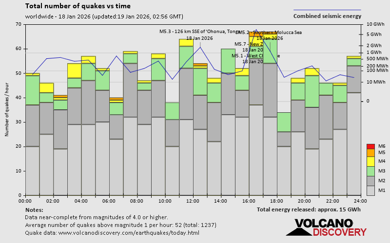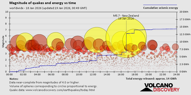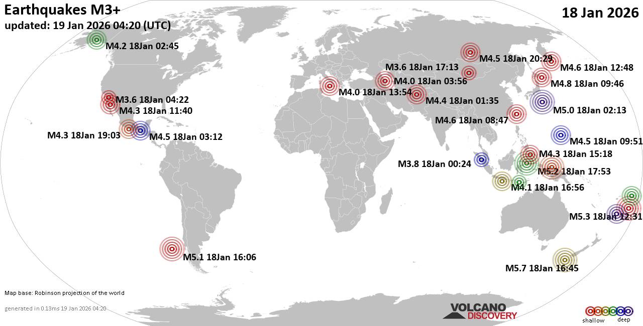 World Earthquake Report for Sunday, 18 January 2026 Worldwide earthquakes above magnitude 3 during the past 24 hours on 19 Jan 2026 Summary: 6 quakes 5.0+, 41 quakes 4.0+, 131 quakes 3.0+, 350 quakes 2.0+ (528 total)Magnitude 5+: 6 earthquakes Magnitude 4+: 41 earthquakes Magnitude 3+: 131 earthquakes Magnitude 2+: 350 earthquakes No quakes of magnitude 6 or higher 10 largest earthquakes in the world (18 Jan 2026)Monday, Jan 19, 2026, at 05:45 am (GMT +13) - Monday, Jan 19, 2026, at 01:31 am (GMT +13) - Monday, Jan 19, 2026, at 01:53 am (GMT +8) - Sunday, Jan 18, 2026, at 11:06 am (GMT -5) - Sunday, Jan 18, 2026, at 03:38 pm (Jayapura time) - Sunday, Jan 18, 2026, at 11:13 am (GMT +9) - Sunday, Jan 18, 2026, at 10:15 am (Jayapura time) - Sunday, Jan 18, 2026, at 12:16 pm (GMT +8) - Sunday, Jan 18, 2026, at 07:46 pm (GMT +10) - Sunday, Jan 18, 2026, at 07:27 pm (GMT +8) - Earthquakes reported feltSunday, Jan 18, 2026, at 01:01 pm (GMT +2) - Sunday, Jan 18, 2026, at 02:54 pm (GMT +1) - Monday, Jan 19, 2026, at 07:52 am (GMT +13) - Sunday, Jan 18, 2026, at 06:54 am (GMT -8) - Sunday, Jan 18, 2026, at 01:06 am (GMT +1) - Saturday, Jan 17, 2026, at 05:45 pm (Anchorage time) - Sunday, Jan 18, 2026, at 12:16 pm (GMT +8) - Sunday, Jan 18, 2026, at 01:03 pm (Mexico City time) - Sunday, Jan 18, 2026, at 08:21 am (GMT -8) - Sunday, Jan 18, 2026, at 07:51 pm (GMT +10) - Monday, Jan 19, 2026, at 05:45 am (GMT +13) - Saturday, Jan 17, 2026, at 10:28 pm (GMT -5) - Sunday, Jan 18, 2026, at 07:56 am (GMT +4) - Sunday, Jan 18, 2026, at 04:02 pm (GMT +6:30) - Sunday, Jan 18, 2026, at 10:34 pm (GMT +8) - Sunday, Jan 18, 2026, at 11:55 am (GMT +8) - Sunday, Jan 18, 2026, at 06:05 am (GMT +4:30) - Sunday, Jan 18, 2026, at 11:13 am (GMT +9) - Earthquake stats  https://www.volcanodiscovery.com/earthquake/news/292231/World-Earthquake-Report-for-Sunday-18-January-2026.html