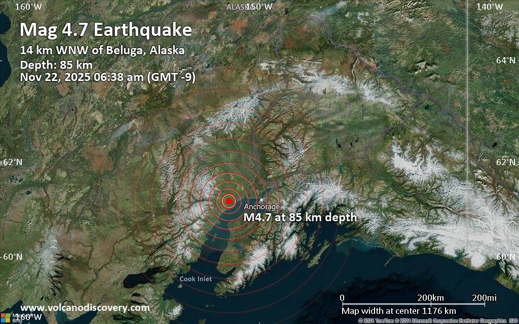 Moderate earthquake of magnitude 4.8 just reported 18 miles northwest of Anchorage, Alaska, United States A moderately shallow magnitude 4.8 earthquake was reported early morning near Anchorage, Alaska, USA. According to the United States Geological Survey, the quake hit on Saturday, November 22nd, 2025, at 6:36 am local time at a moderately shallow depth of 28 miles. The exact magnitude, epicenter, and depth of the quake might be revised within the next few hours or minutes as seismologists review data and refine their calculations, or as other agencies issue their report. A second report was later issued by The Incorporated Research Institutions for Seismology (IRIS), which listed it as a magnitude 4.0 earthquake. A third agency, the European-Mediterranean Seismological Centre (EMSC), reported the same quake at magnitude 4.9. Based on the preliminary seismic data, the quake should not have caused any significant damage, but was probably felt by many people as light vibration in the area of the epicenter. Weak shaking might have been felt in Point MacKenzie (pop. 530) located 12 miles from the epicenter, Big Lake (pop. 3,400) 16 miles away, Anchorage (pop. 289,600) 18 miles away, Elmendorf Air Force Base (pop. 6,600) 25 miles away, Eagle River (pop. 24,800) 26 miles away, Eagle River (pop. 24,800) 26 miles away, Knik-Fairview (pop. 14,900) 26 miles away, Meadow Lakes (pop. 7,600) 30 miles away, Wasilla (pop. 9,300) 33 miles away, and Tanaina (pop. 8,200) 35 miles away. VolcanoDiscovery will automatically update magnitude and depth if these change and follow up if other significant news about the quake become available. If you’re in the area, please send us your experience through our reporting mechanism, either online or via our mobile app. This will help us provide more first-hand updates to anyone around the globe who wants to know more about this quake.