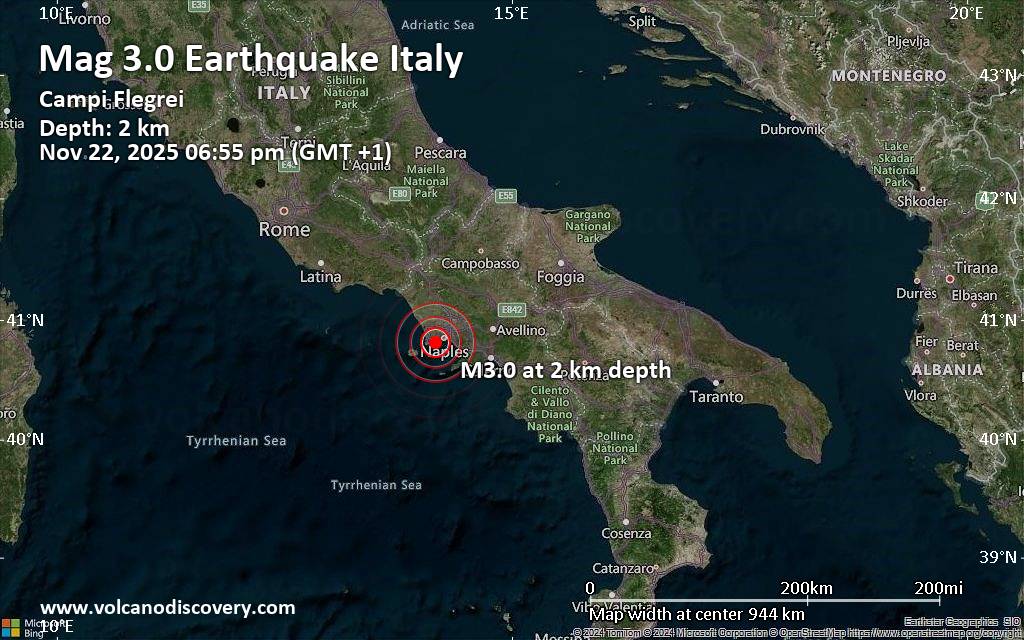 Small 3.0 quake hits near Naples, Campania, Italy A magnitude 3.0 earthquake near Naples, Campania, Italy, was reported 38 minutes ago by Italy's National Institute of Geophysics and Volcanology (INGV), considered the main national agency that monitors seismic activity in Italy. The earthquake occurred at a very shallow depth of 2.38 km beneath the epicenter early evening on Saturday, November 22nd, 2025, at 6:55 pm local time. Magnitude and other quake parameters can still change in the coming hours as the agency continues to process seismic data. Our monitoring service identified a second report from the European-Mediterranean Seismological Centre (EMSC) which listed the quake at magnitude 3.0 as well. Based on the preliminary seismic data, the quake was probably felt by many people in the area of the epicenter. It should not have caused significant damage, other than objects falling from shelves, broken windows, etc. In Bagnoli (pop. 23,300) located 1 km from the epicenter, the quake should have been felt as light shaking. Weak shaking might have been felt in Posillipo (pop. 22,900) located 3 km from the epicenter, Fuorigrotta (pop. 76,500) 4 km away, Soccavo (pop. 45,300) 4 km away, Pianura (pop. 57,800) 5 km away, Pozzuoli (pop. 81,200) 6 km away, and Quarto (pop. 37,700) 7 km away. Other towns or cities near the epicenter where the quake might have been felt as very weak shaking include Naples (pop. 909,000) located 10 km from the epicenter, and Giugliano in Campania (pop. 80,300) 13 km away.