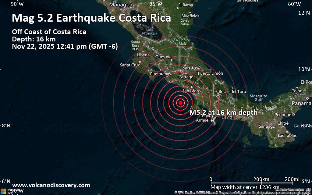 Earthquake data: Date & time: Nov 22, 2025 12:41 pm (GMT -6) local time (22 Nov 2025 18:41 GMT)Magnitude: 5.2 Depth: 16.00 km Epicenter latitude / longitude: 8.82°N / 84.12°W  ( Provincia de Puntarenas, Costa Rica) Primary data source: EMSChttps://www.volcanodiscovery.com/earthquake/news/287587/Significant-magnitude-52-quake-hits-77-km-southwest-of-San-Isidro-Costa-Rica-around-noon-.html