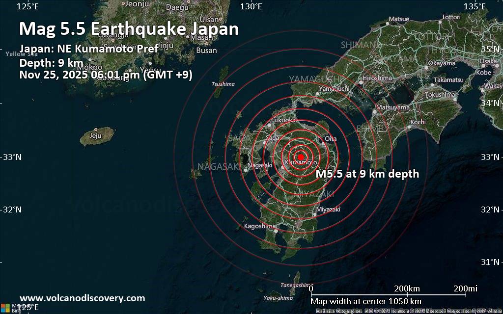 Earthquake data: Date & time: Nov 25, 2025 06:01 pm (GMT +9) local time (25 Nov 2025 09:01 GMT)Magnitude: 5.5 Depth: 17.90 km Epicenter latitude / longitude: 33.04°N / 130.99°E  ( Aso-gun, Kumamoto, Japan) Primary data source: EMSChttps://www.volcanodiscovery.com/earthquake/news/287763/Significant-magnitude-55-quake-hits-7-km-northeast-of-Aso-Japan-early-evening-.html