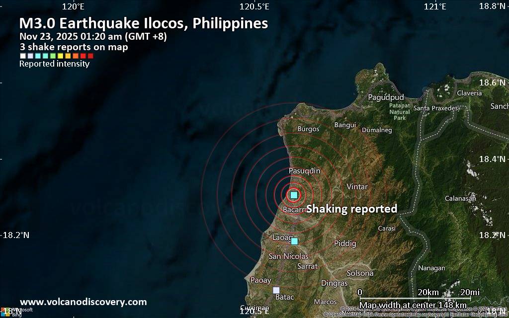 Earthquake data: Date & time: Nov 23, 2025 01:20 am (GMT +8) local time (22 Nov 2025 17:20 GMT)Magnitude: unspecified Depth: unspecified Epicenter latitude / longitude: 18.31°N / 120.61°E  ( Ilocos, Philippines) Primary data source: VolcanoDiscoveryhttps://www.volcanodiscovery.com/earthquake/news/287575/Seismic-like-event-possible-earthquake-reported-few-minutes-ago-near-Laoag-Ilocos-Philippines.html