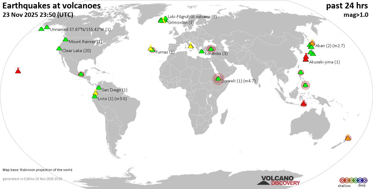 Volcano earthquake report for Sunday, 23 Nov 2025 World map showing volcanoes with shallow (less than 50 km) earthquakes within 20 km radius during the past 24 hours on 23 Nov 2025 Number in brackets indicate nr of quakes. Quakes detected near: Akan (2 quakes between mag 1.0-2.7), Akuseki-jima (1 quake mag 1.7), Borawli (1 quake mag 4.7), Camiguin de Babuyanes (1 quake mag 2.3), Campi Flegrei (Phlegrean Fields) (22 quakes between mag 0.1-1.6), Cerro Negro de Mayasquer (1 quake mag 1.6) Clear Lake (20 quakes between mag 0.2-1.6), El Chichón (1 quake mag 2.3), Erciyes Dagi (1 quake mag 3.0), Furnas (1 quake mag 2.2), Grímsvötn (3 quakes between mag 0.1-1.0), Hakkoda (1 quake mag 3.0), Katla (3 quakes between mag 0.4-1.8), Kilauea (2 quakes between mag 1.8-2.2), Kirishima (5 quakes between mag 0.2-1.0), Kolumbo (3 quakes between mag 1.4-1.8), Komaga-take (3 quakes between mag 0.3-1.4), Krísuvík (8 quakes between mag 0.1-1.6), Lewotolo (1 quake mag 2.8), Licto (1 quake mag 3.0), Ljósufjöll (4 quakes between mag 0.2-1.4), Loki-Fögrufjöll volcano (3 quakes between mag 0.4-1.5), Mount Rainier (1 quake mag 1.0), Musuan (1 quake mag 3.0), Nii-jima (1 quake mag 1.1), Ontake-san (6 quakes between mag 0.1-1.2), Osore-yama (2 quakes between mag 0.3-1.1), San Diego (1 quake mag 1.1), Suwanose-jima (1 quake mag 1.5), Terceira (1 quake mag 3.2), Tjörnes Fracture Zone (6 quakes between mag 0.3-1.4), To-shima (2 quakes between mag 1.3-1.7), Veniaminof (1 quake mag 1.2), Vesuvius (3 quakes between mag 0.1-1.7), White Island (1 quake mag 2.1) (updated 23h50) Note: Earthquakes within 20 km from and at depths less than 50 km under active volcanoes are reported. The list is not complete because many volcanoes are not monitored and/or seismic data in high resolution is not available publicly.