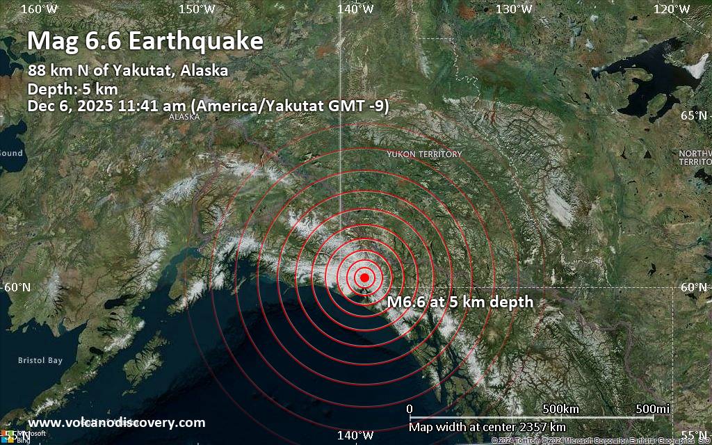 Magnitude 6.6 earthquake strikes near Yakutat, Yakutat City and, Alaska, USA A very shallow magnitude 6.6 earthquake was reported in the morning near Yakutat, Yakutat City and, Alaska, USA. According to the United States Geological Survey, the quake hit on Saturday, December 6th, 2025, at 11:41 am local time at a very shallow depth of 3.1 miles. Shallow earthquakes are felt more strongly than deeper ones as they are closer to the surface. The exact magnitude, epicenter, and depth of the quake might be revised within the next few hours or minutes as seismologists review data and refine their calculations, or as other agencies issue their report. Based on the preliminary seismic data, the quake should have been widely felt by almost everyone in the area of the epicenter. It might have caused light to moderate damage. Moderate shaking probably occurred in Yakutat (pop. 660) located 55 miles from the epicenter. VolcanoDiscovery will automatically update magnitude and depth if these change and follow up if other significant news about the quake become available. If you’re in the area, please send us your experience through our reporting mechanism, either online or via our mobile app. This will help us provide more first-hand updates to anyone around the globe who wants to know more about this quake.